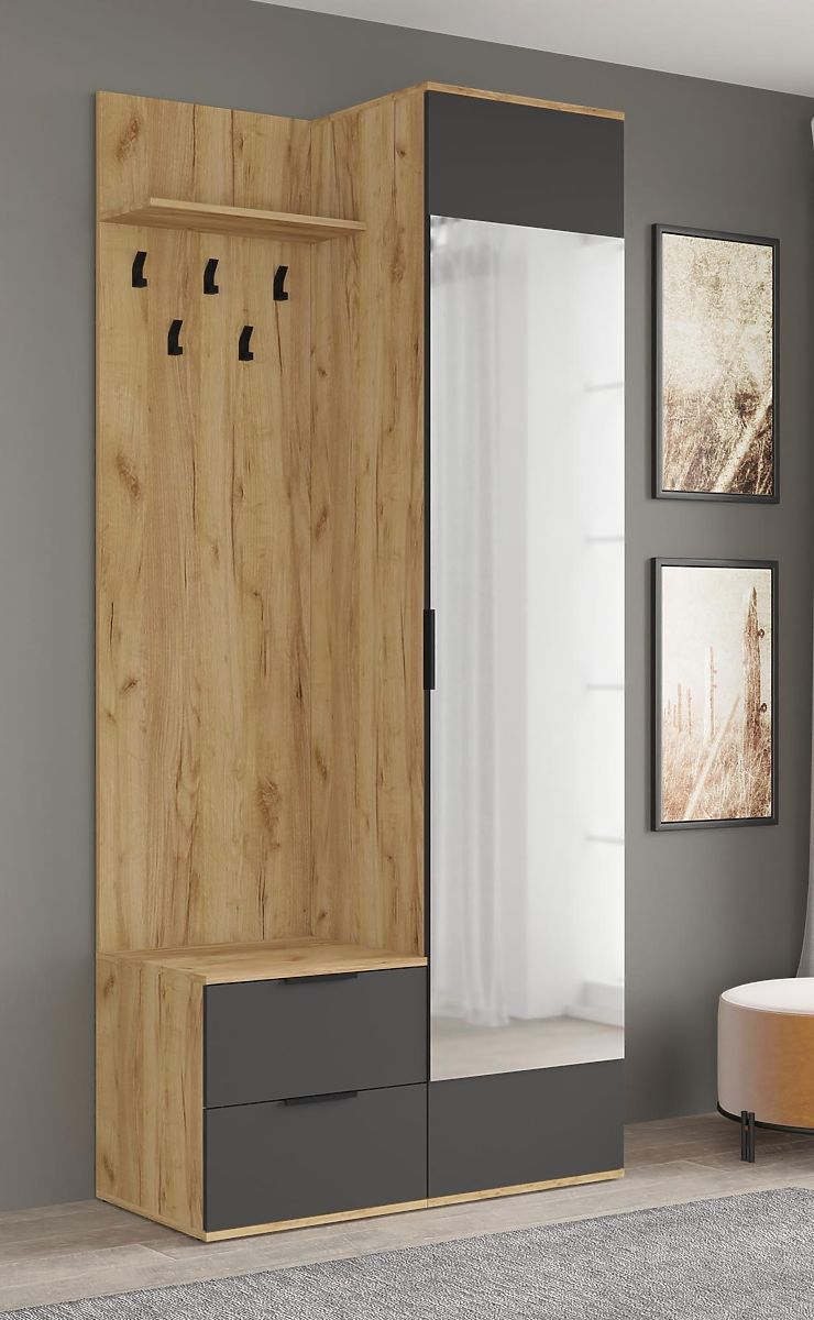 Předsíňová stěna CORAL v kombinaci zlatý dub / antracit je elegantní a praktický nábytek pro vstupní prostory. Nabízí dostatek úložného prostoru, přehledné uspořádání a zároveň stylový vzhled, který doplní moderní i klasické interiéry.