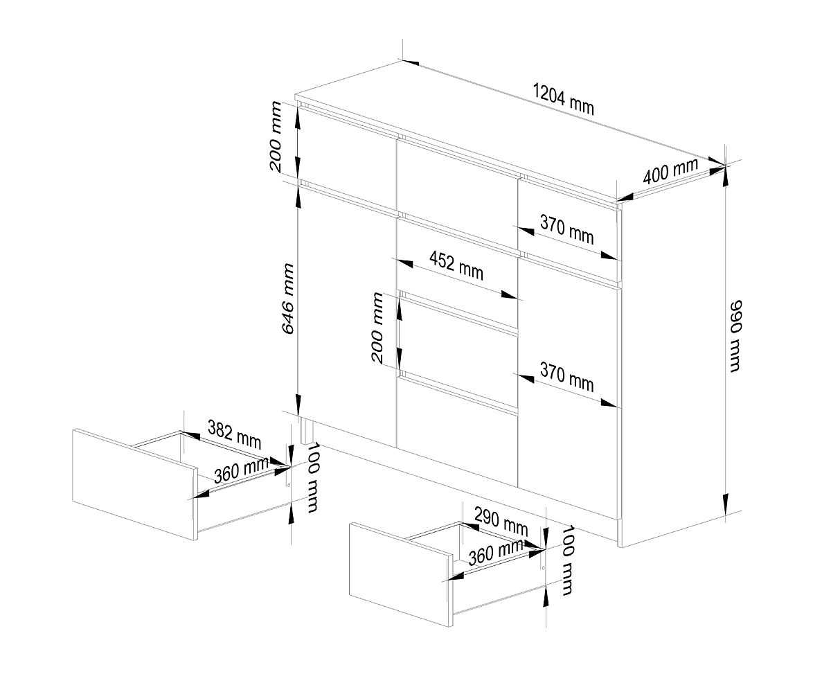 - Komoda vyrobena z vysoce kvalitní laminované desky 16 mm odolné proti oděru