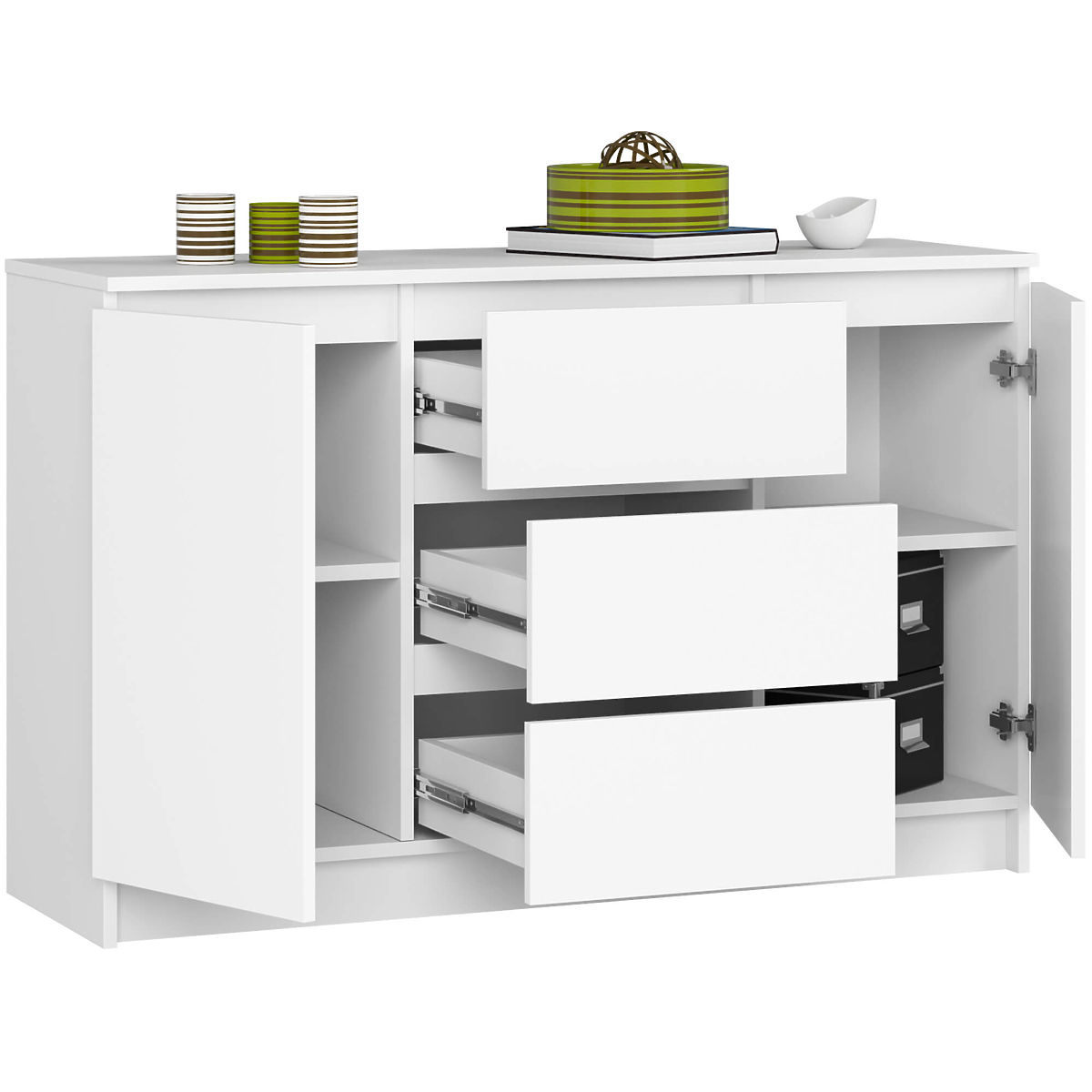 Bílá komoda s matným povrchem a třemi zásuvkami. .. více