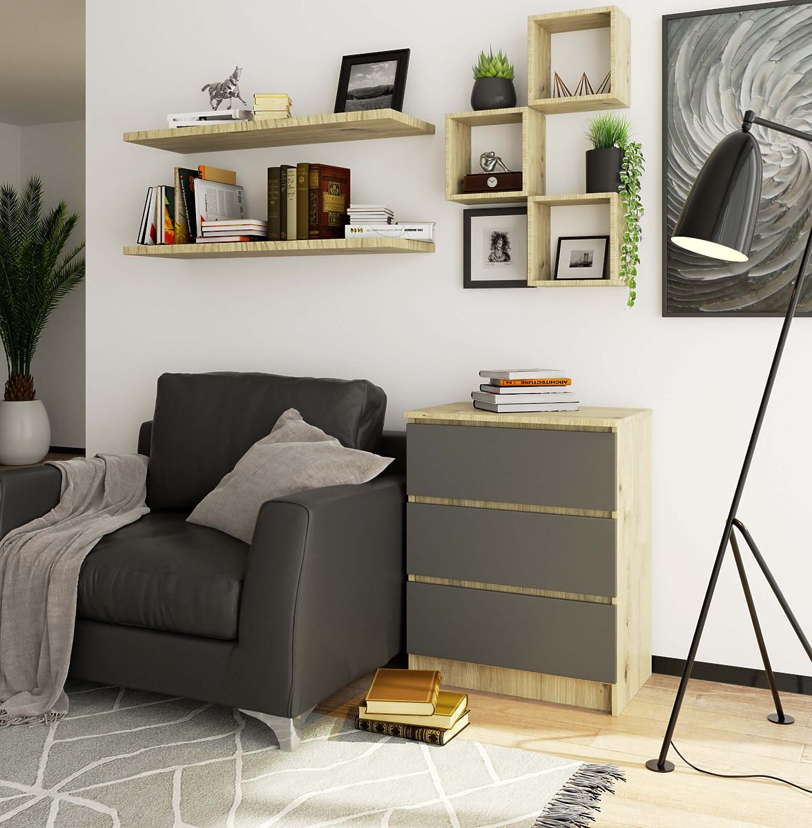 Komoda s třemi zásuvkami v dekoru Dub Artisan a šedými čely. .. více