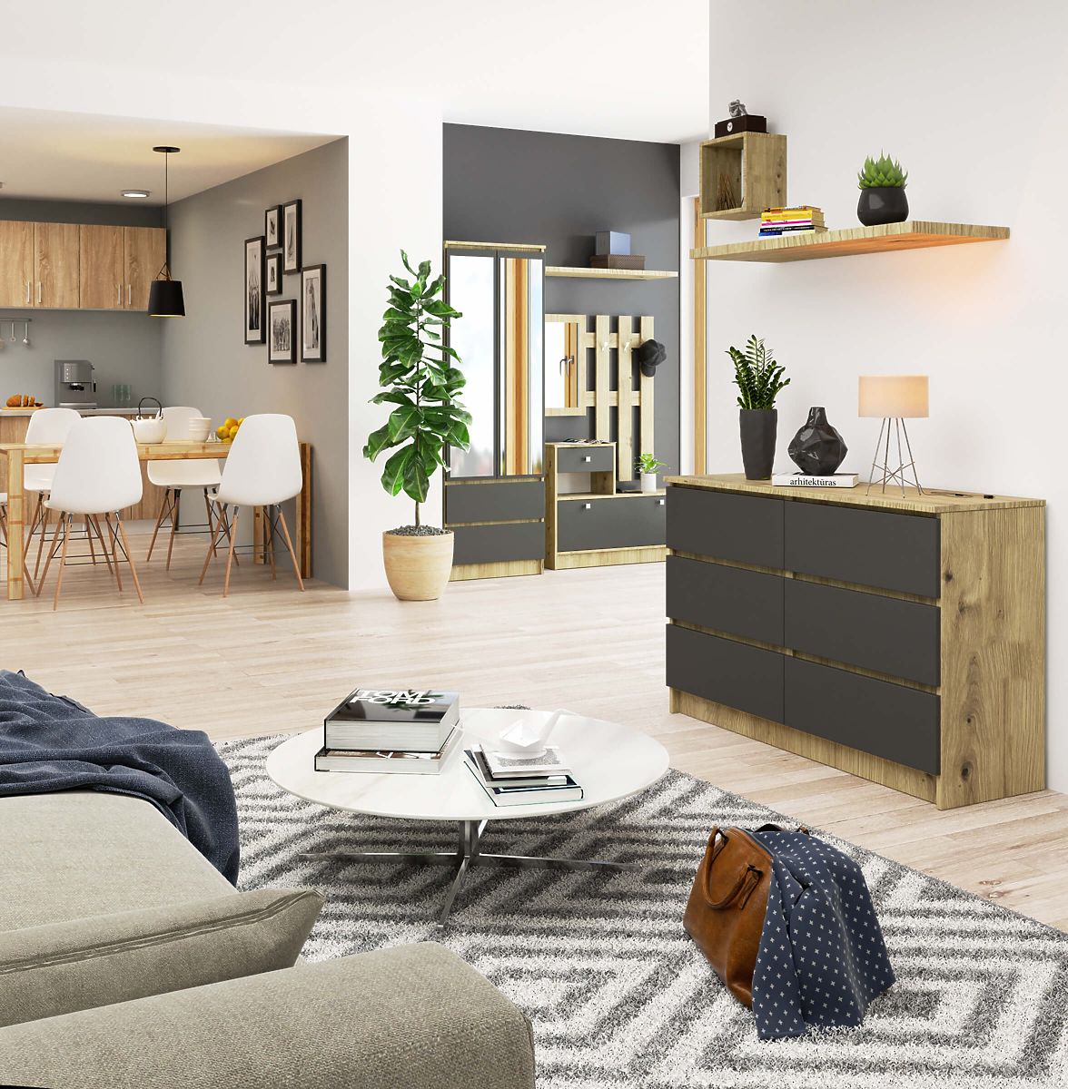 Komoda s 6 zásuvkami v barvě Dub Artisan a Šedá. .. více