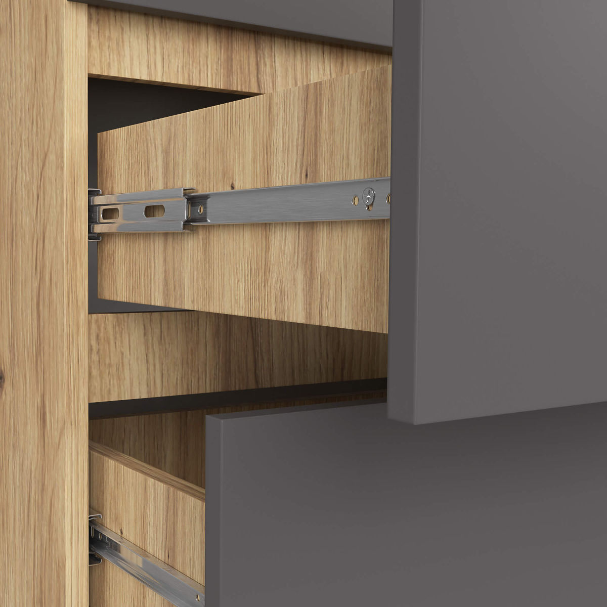 - Zásuvky se pohybují na kovových válečkových pojezdech- Hrany olepené ABS hranou zajišťující vysokou ochranu proti poškození