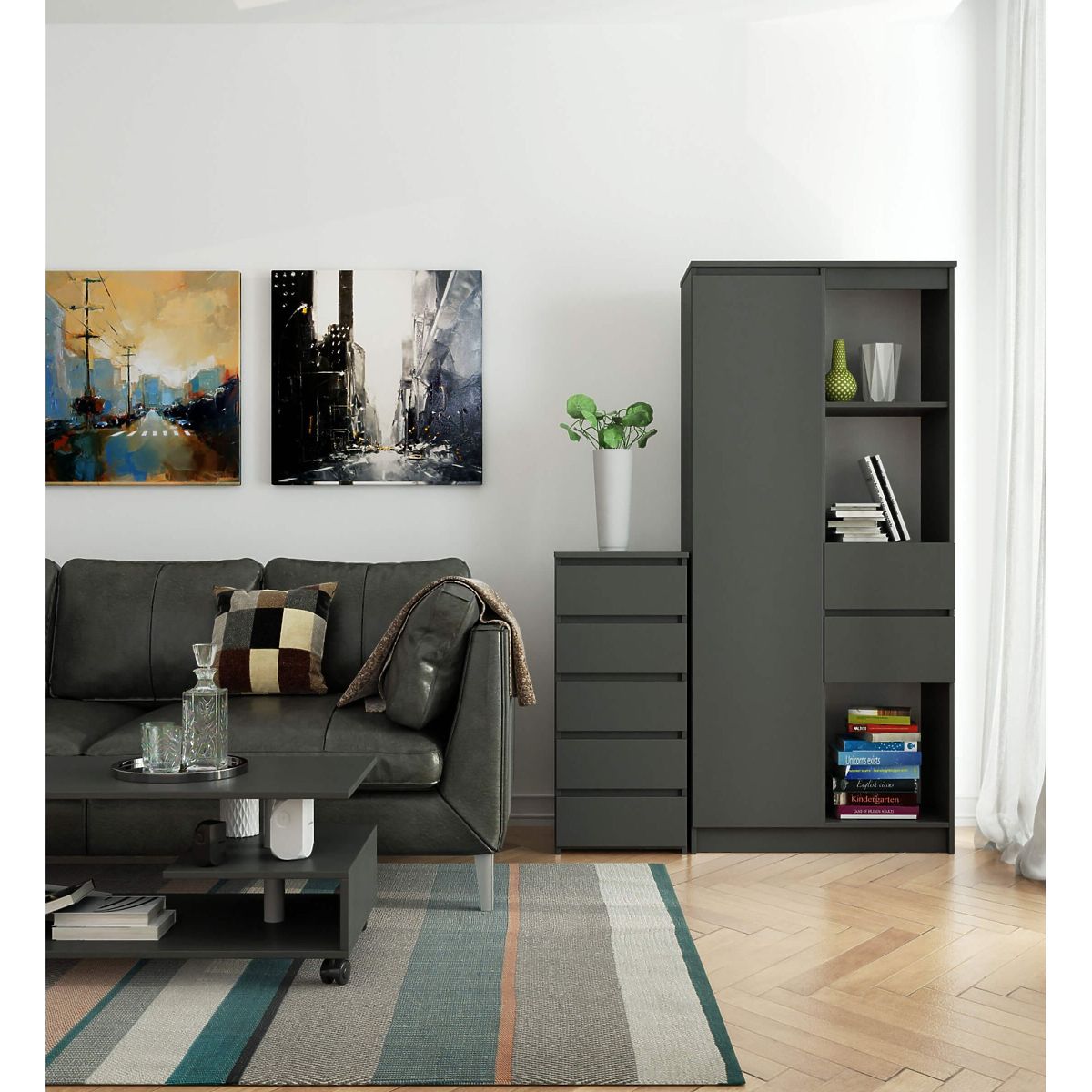 - elegantní vzhled - komoda je jednoduchá ve formě, vyznačuje se stylovou barvou grafit šedá,