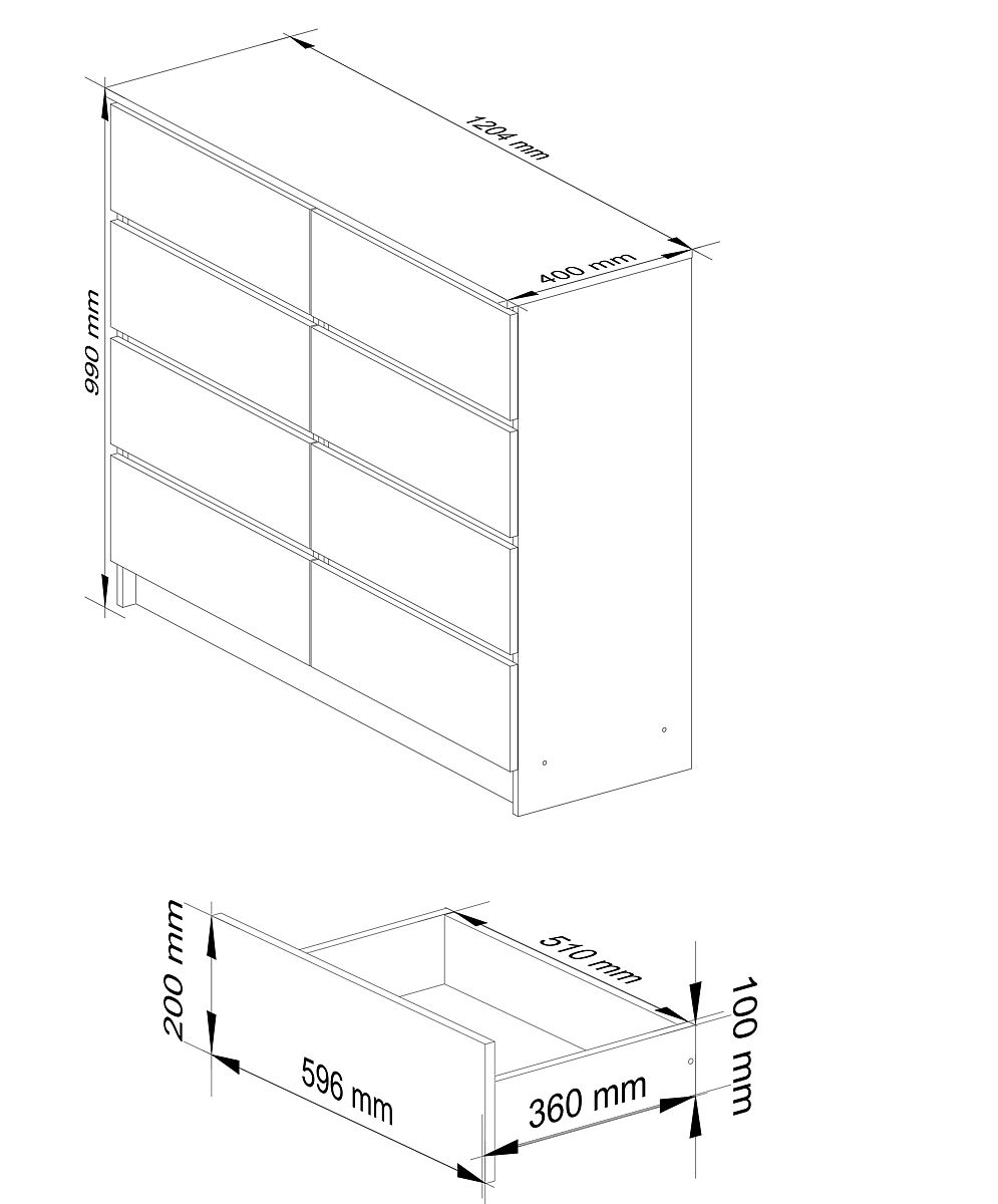 Vyrobena z 16mm laminované desky od firmy Kronospan. Hrany komody jsou opatřeny ABS hranou, která zvyšuje odolnost komody proti poškození.