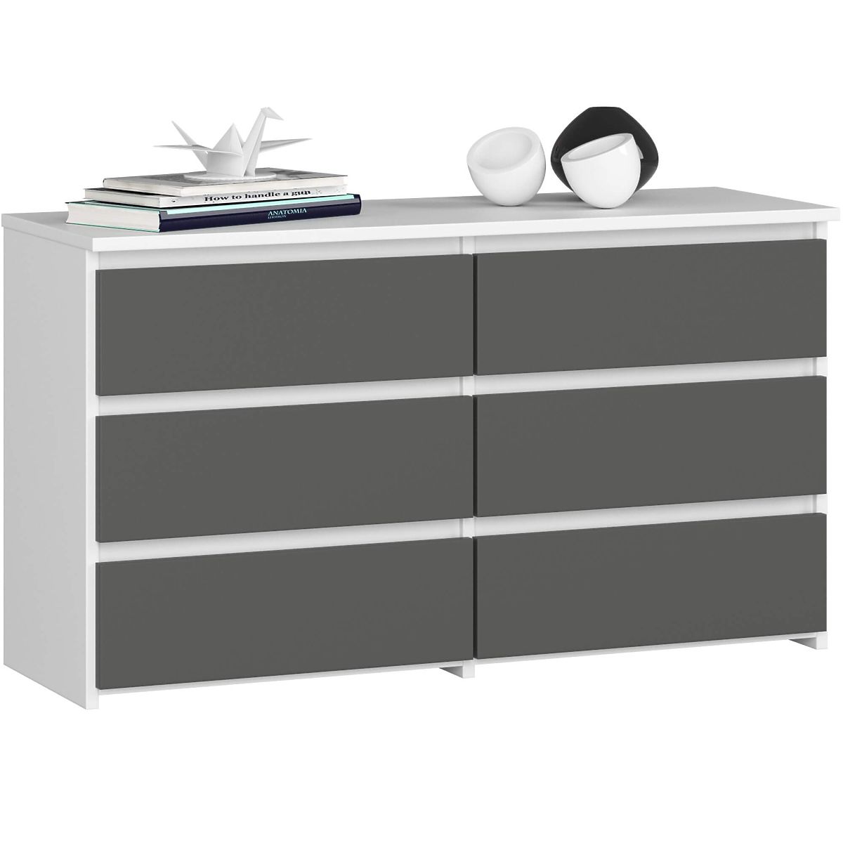 Bílá komoda s šesti zásuvkami a grafitově šedými čely. .. více