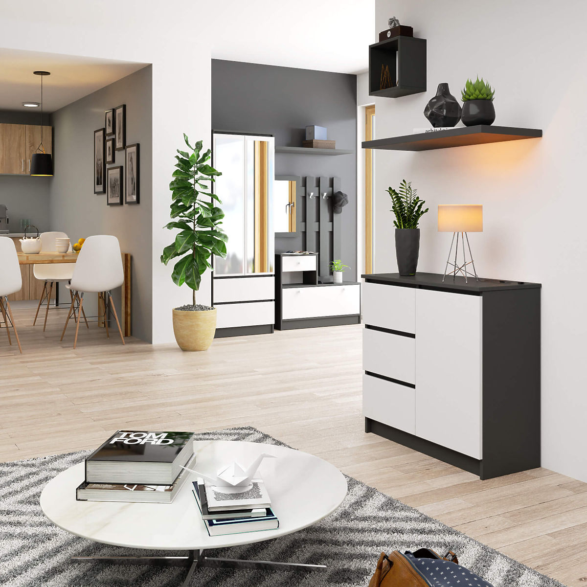 Malá komoda je prvkem vybavení, který najde uplatnění v každé místnosti. Moderní barvy, solidní konstrukce a pečlivé zpracování vedly ke vzniku skříňky, která se osvědčí například v předsíni, obývacím nebo dětském pokoji, ale také v ložnici. Může být využita i v kancelářském prostoru, kde umožní uložení mnoha dokumentů a dalších kancelářských potřeb. Komoda se skládá z jedněch dvířek (uvnitř jsou dvě police) a 3 zásuvek. Nábytek kombinuje barvy grafitové šedé a bílé.