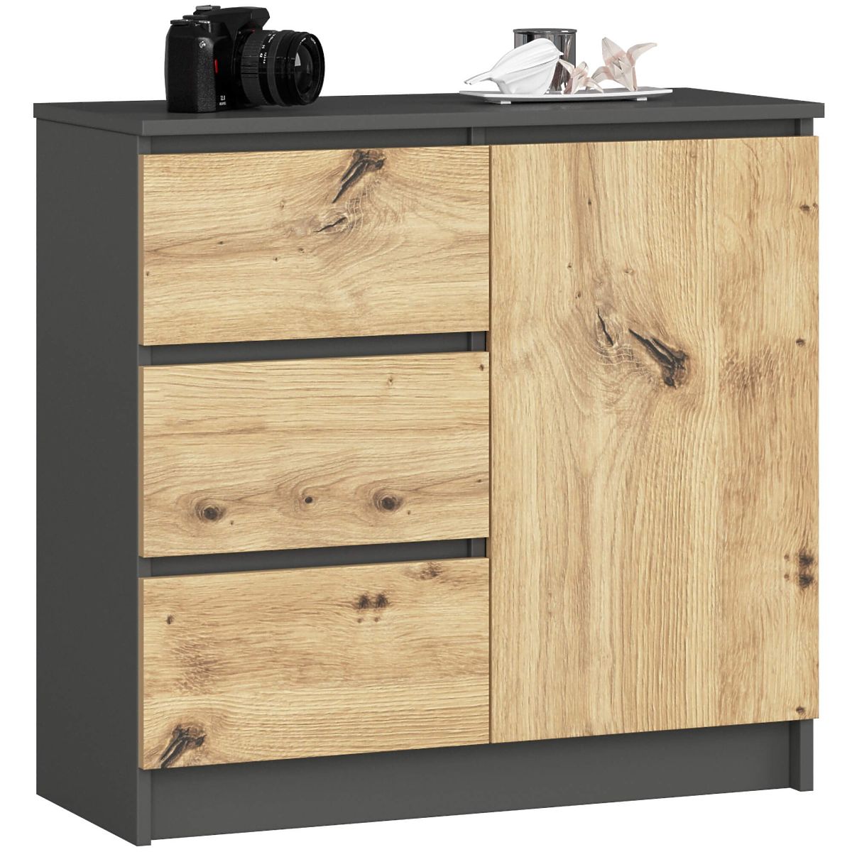 Malá komoda je součástí vybavení, která najde uplatnění v každé místnosti. Moderní barvy, pevná konstrukce a pečlivé zpracování vedly ke vzniku skříňky, která se osvědčí například v předsíni, obývacím či dětském pokoji, ale také v ložnici. Může být využita i v kancelářském prostoru, kde umožní ukládání mnoha dokumentů a dalších kancelářských potřeb. Komoda se skládá z jedněch dvířek (uvnitř se nacházejí dvě police) a 3 zásuvek. Nábytek kombinuje barvy grafit šedá a dub artisan.