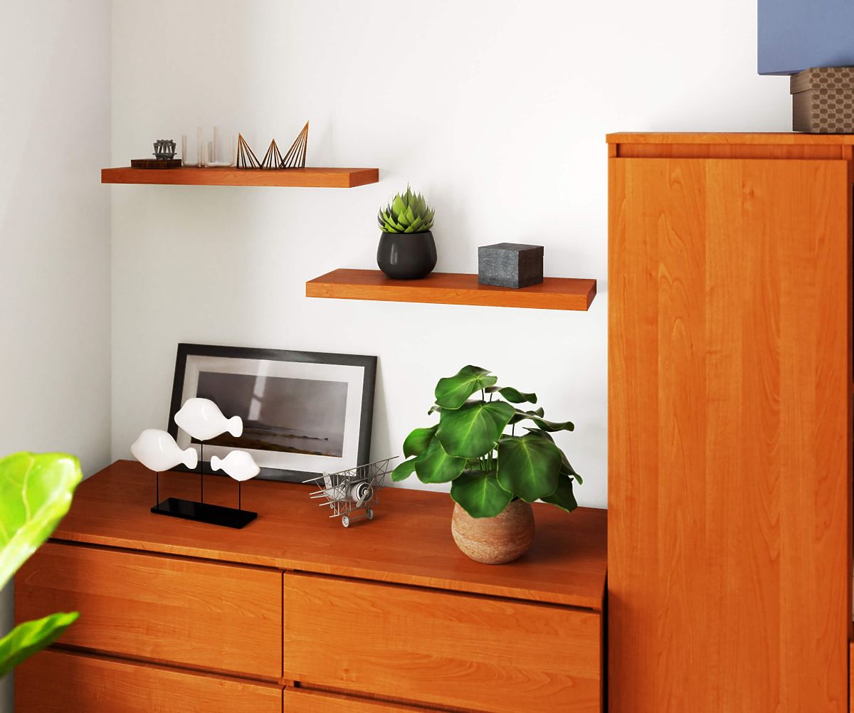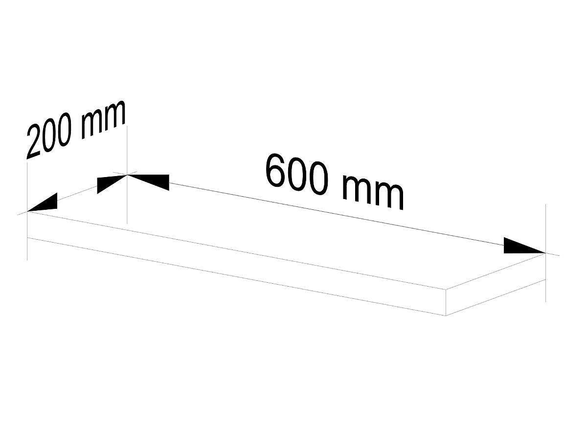 Vyrobena z laminované desky odolné proti oděru. Hrana je olepena melaminem. Součástí balení jsou neviditelné nástěnné držáky.
