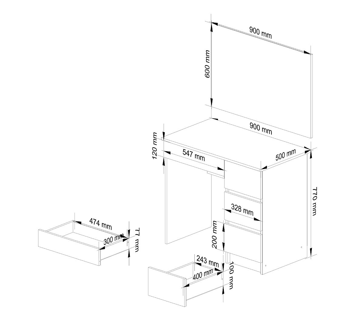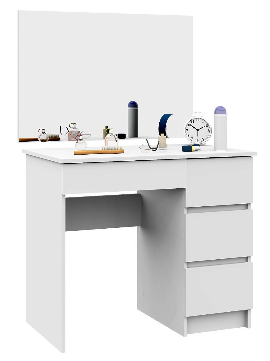 Kosmetický toaletní stolek se zrcadlem je vynikajícím nábytkem pro líčení. Toaletní stolek má funkční desku, na kterou lze položit nejpotřebnější věci, a čtyři prostorné zásuvky, které pojmou všechny drobnosti. V sadě s přizpůsobeným zrcadlem vytváří toaletní stolek ideální podmínky pro líčení a každodenní ženská rutina bude od nynějška mnohem příjemnější. Vhodné rozměry toaletního stolku (77 cm výška, 90 cm šířka, 50 cm hloubka) zajišťují pohodlný pohyb a používání toaletního stolku. Rozsáhlé zrcadlo (60 cm na 90 cm) umožňuje precizní provedení i těch nejsložitějších kosmetických úkonů. Tato sada se osvědčí i v malém prostoru. Toaletní stolek je vyroben z odolné, proti oděru a poškození odolné laminované desky a neutrální, módní bílá barva se hodí do každého interiéru. Ideální nábytek do ložnice nebo jiné místnosti, který potěší každou ženu pečující o krásu.