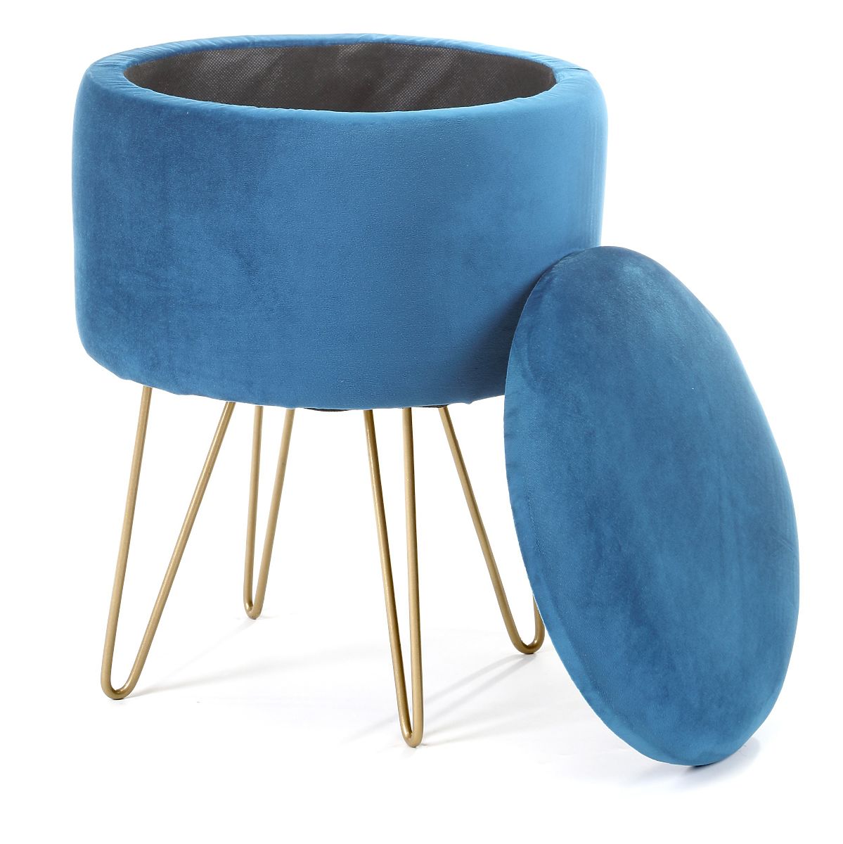 Modrá pufa s úložným prostorem a zlatými kovovými nohami. .. více