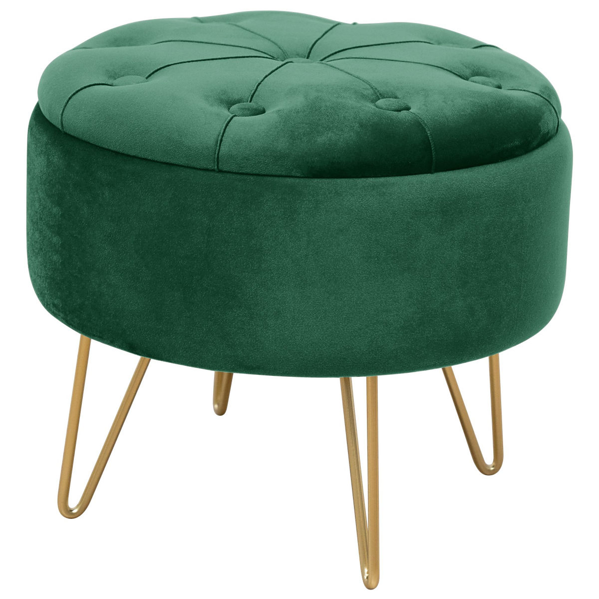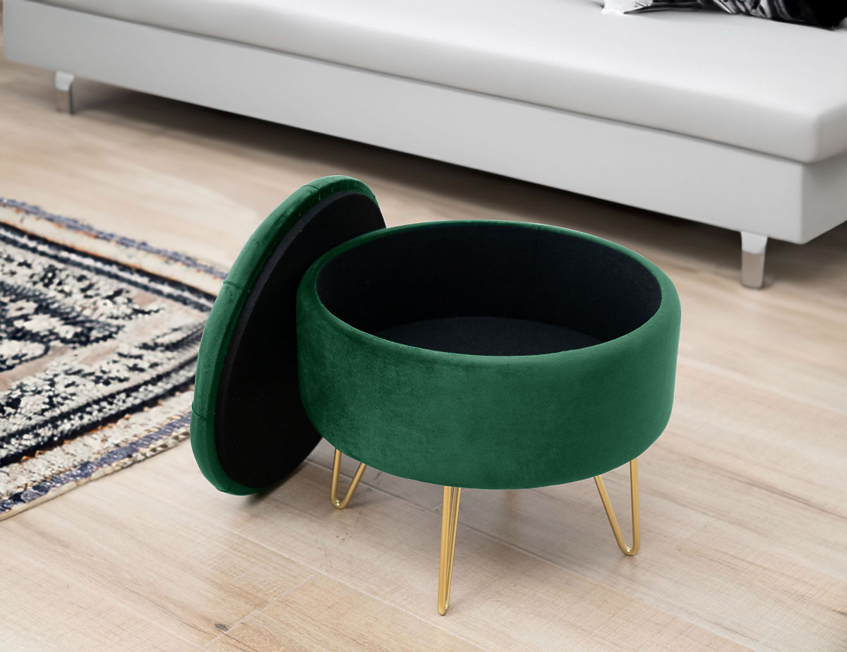 Podnožka nebo puf je skvělým doplňkem do obývacího pokoje nebo ložnice. Díky němu si unavené nohy po celodenním chození mohou odpočinout, a pokud je puf vyroben z měkkého veluru, jen to umocňuje příjemné pocity z odpočinku. Moderní vzhled doplňují kovové nohy natřené na zlatou barvu, která je letos tak módní. Otevírací víko poskytuje přístup k úložnému prostoru, kam lze uložit předměty nepotřebné pro každodenní použití.Specifikace: