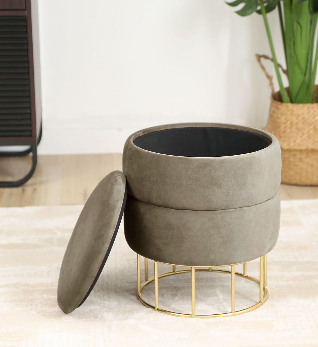 Puf s úložným prostorem na kovové základně zlaté barvy.