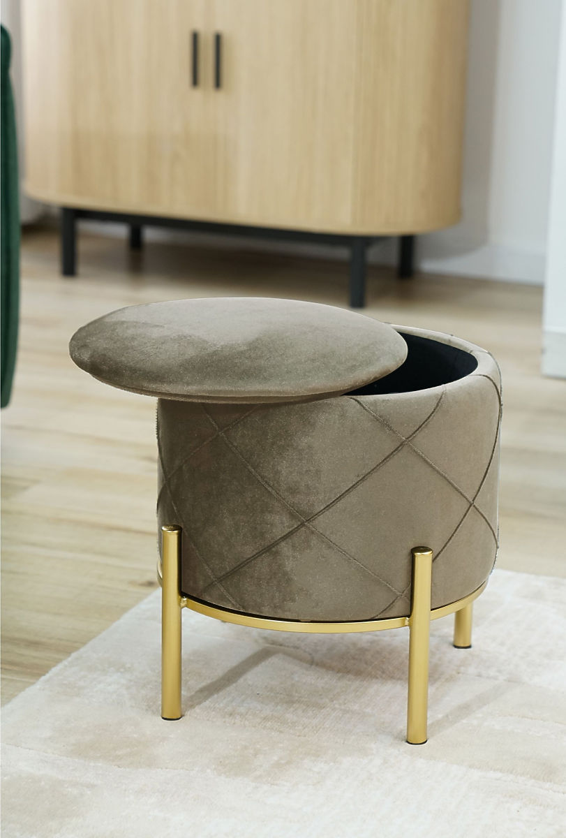 Podnožka nebo puf je skvělým doplňkem do obývacího pokoje nebo ložnice. Díky němu si unavené nohy po celodenním chození mohou odpočinout, a pokud je puf vyroben z měkkého veluru, jen to umocňuje příjemné pocity z odpočinku. Moderní vzhled doplňují kovové nohy natřené na zlatou barvu, která je letos tak módní. Otevírací víko poskytuje přístup k úložnému prostoru, kam lze uložit předměty nepotřebné pro každodenní použití.Specifikace: