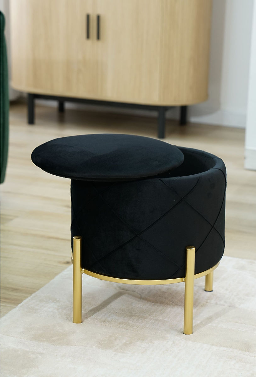 Černý puf s úložným prostorem a kovovými nohami ve zlaté barvě. .. více