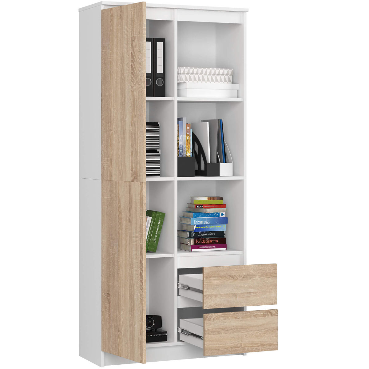 Kancelářský regál s dvířky a zásuvkami v kombinaci bílé a sonoma barvy.