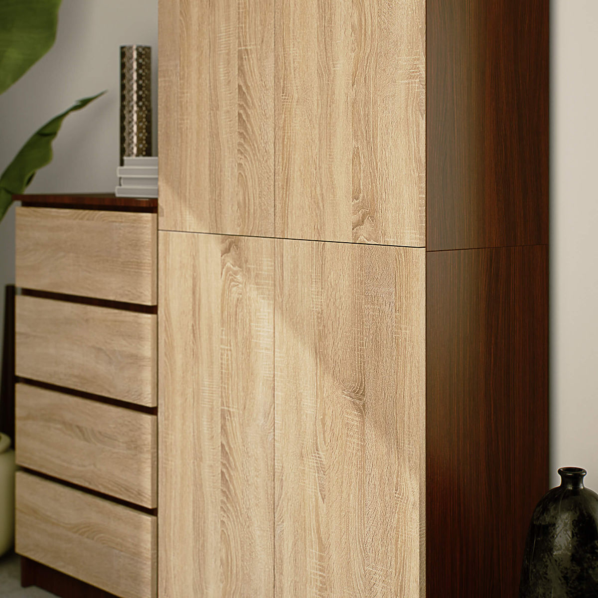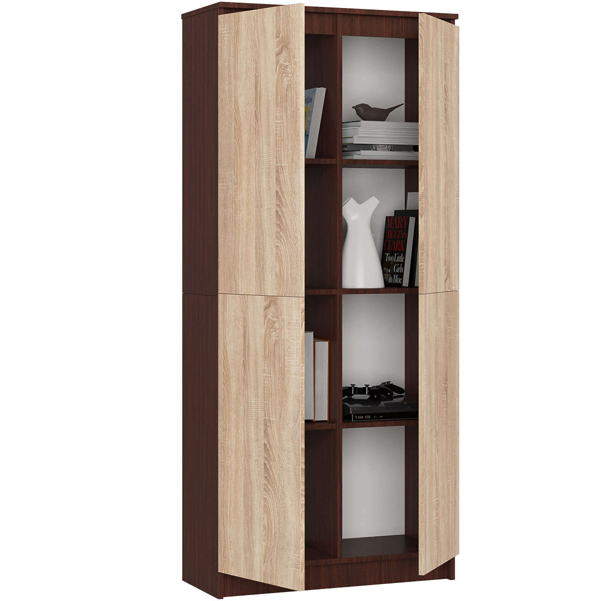 Uzavřený regál s 8 policemi a dveřmi v barvě wenge a dub Sonoma. .. více