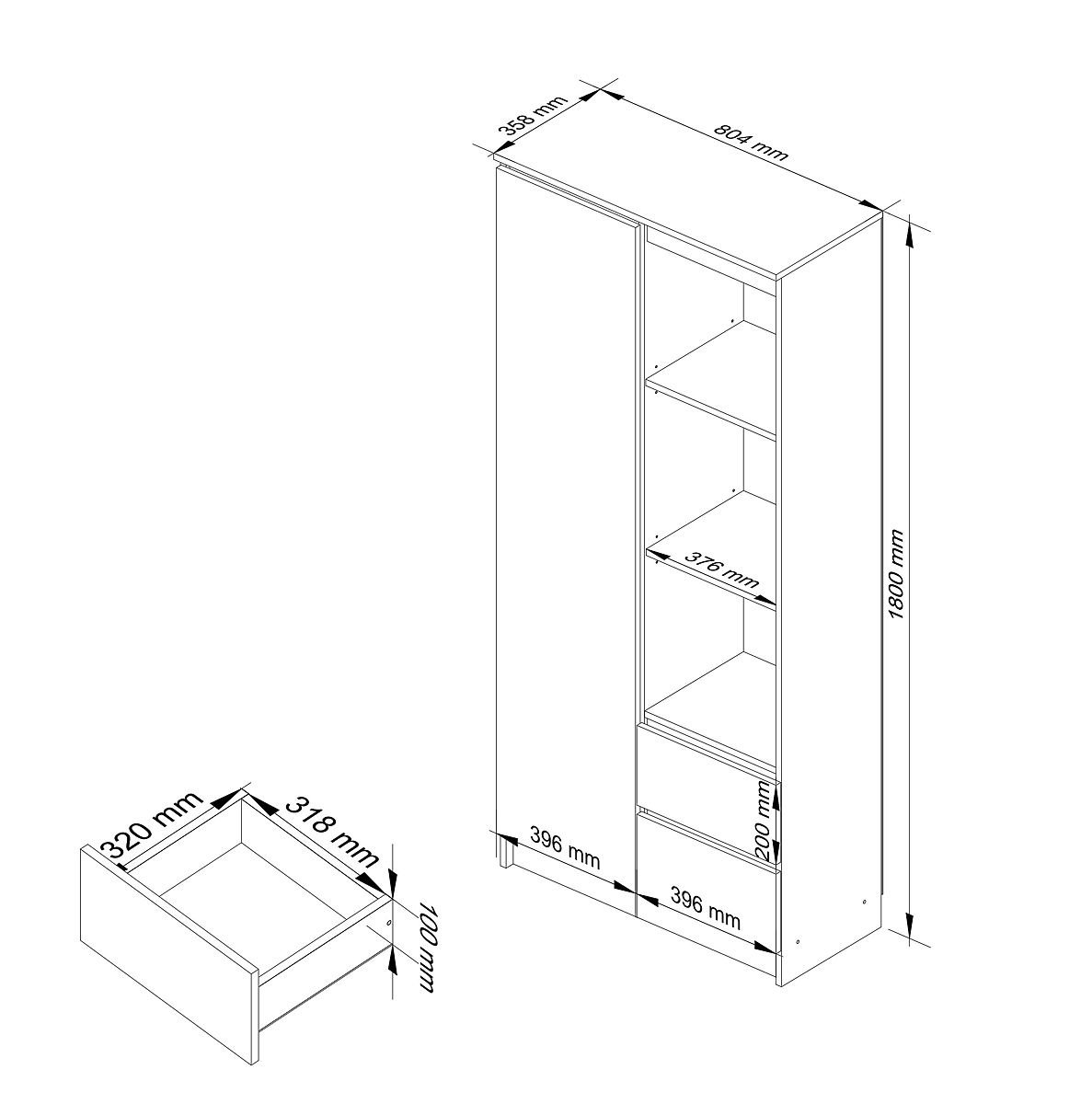 Kancelářský regál s dvířky a zásuvkami v bílé barvě s čelními plochami v grafitovém lesku.