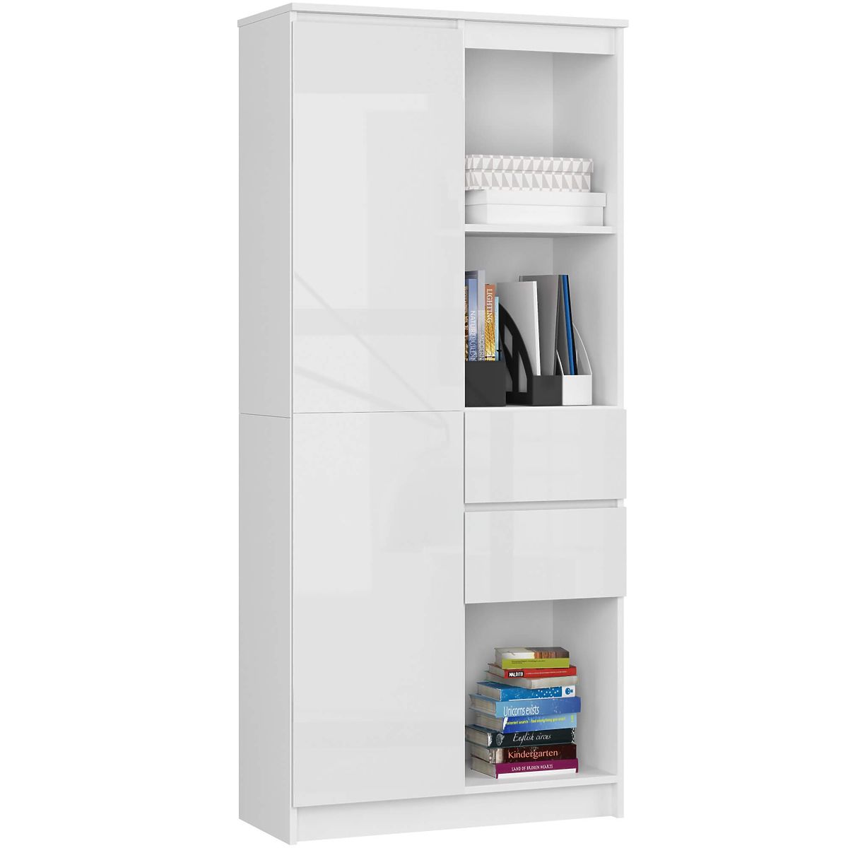 Bílý kancelářský regál s vysokým leskem a 6 policemi. .. více