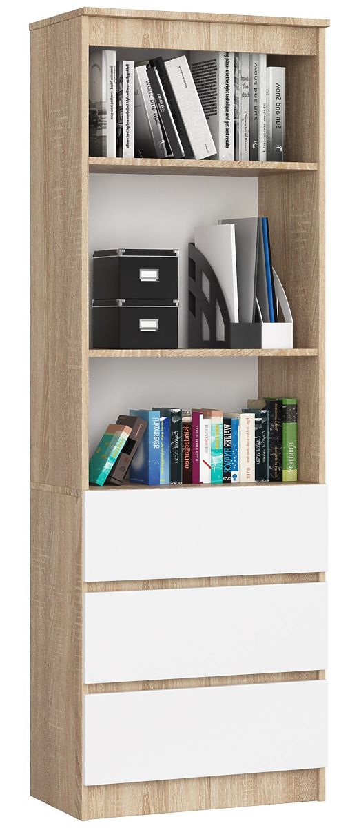 Kancelářský regál, model CLP, se vyznačuje originální kombinací barev. Přirozená barva dubu sonoma korpusu nábytku a univerzální bílá čelních stran zásuvek tvoří dokonalou kombinaci, která se skvěle hodí do stylu moderní kanceláře a domácí pracovny. Elegantní vzhled je velkým plusem tohoto modelu.