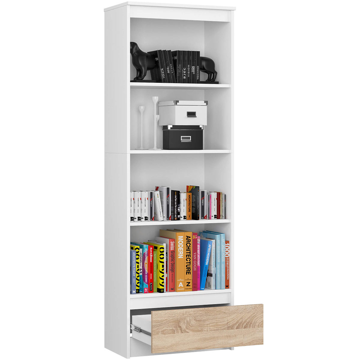 Otevřený regál se 3 policemi a vysouvací zásuvkou. Rozměr 60x180x35