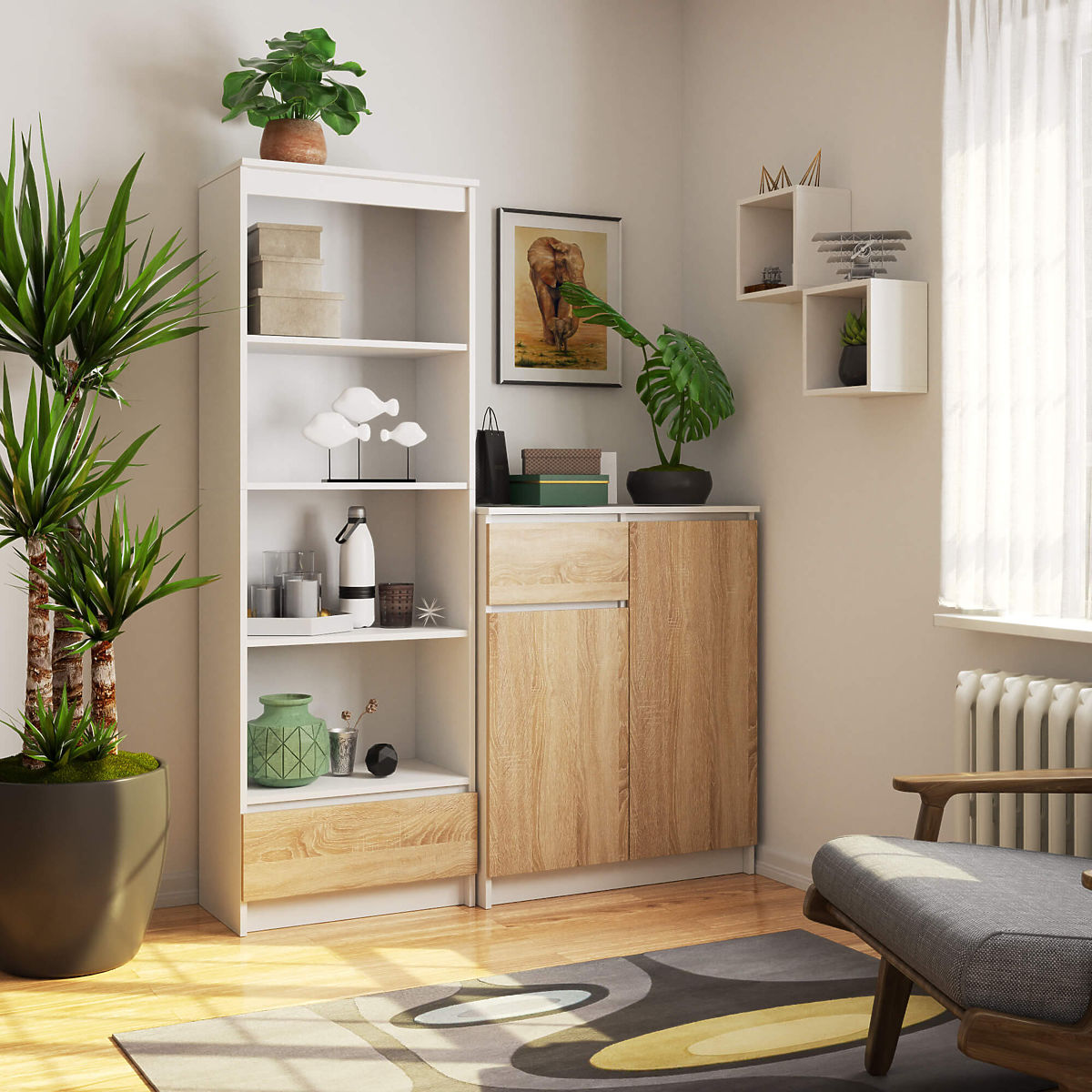 Otevřený regál se 3 policemi a zásuvkou. .. více