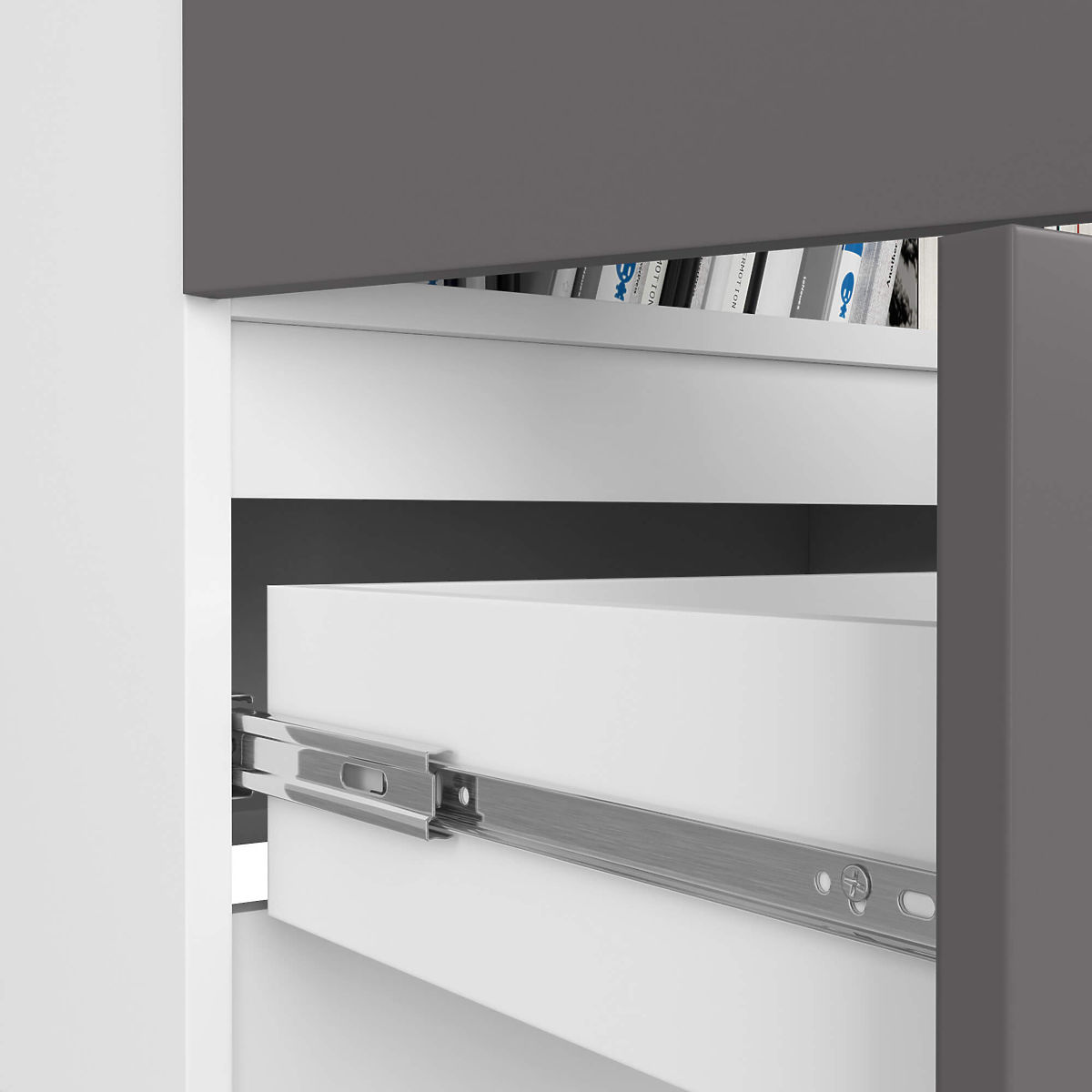 Kancelářský regál CLP 1 je vybaven prostornou skříňkou o výšce 180 cm a šířce 60 cm. Nábytek má výklopné dveře, za kterými se nacházejí 4 prostorné police. Ty lze libovolně konfigurovat, protože mají 3 montážní otvory. Dalším vylepšením je prostorná zásuvka, která se pohybuje na moderních, praktických kuličkových pojezdech. Zásuvka má blokaci výsuvu. Čela nábytku jsou vyrobena v elegantní grafitově šedé barvě, zatímco korpus je bílý.