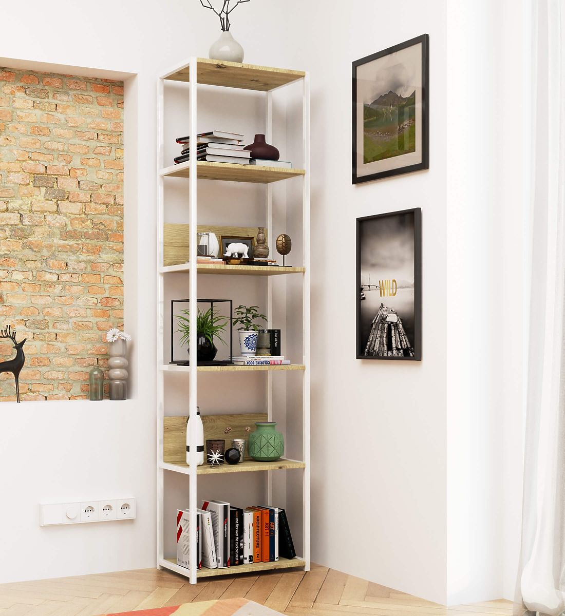 Kovový loftový regál je praktický a moderní nábytek, který se hodí jak do obývacího pokoje, tak do kanceláře. Regál s bílým kovovým rámem a 6 policemi v barvě Dub Artisan. Police regálu jsou vyrobeny z laminované desky o tloušťce 16 mm. Je to trvanlivý a odolný materiál, který se vyznačuje vysokou odolností proti oděru. Hrany jsou dodatečně chráněny ABS hranou, díky čemuž bude nábytek stále dobře vypadat, i při velmi intenzivním každodenním používání. Regál je vybaven 6 policemi, na které lze umístit předměty, které chceme vystavit nebo mít jednoduše po ruce. Celkově působí velmi stylově a moderně.