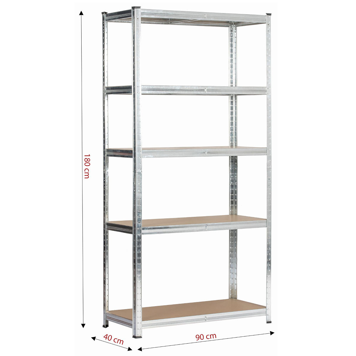 Hloubka - 40 cmKovový regál ideální pro skladování. Hodí se do garáže, dílny, sklepní kóje i do hospodářských místností. Regál ve stříbrné barvě o šířce 90 cm a výšce 180 cm. Police jsou vyrobeny z odolné MDF desky. Nosnost na polici je 175 kg.