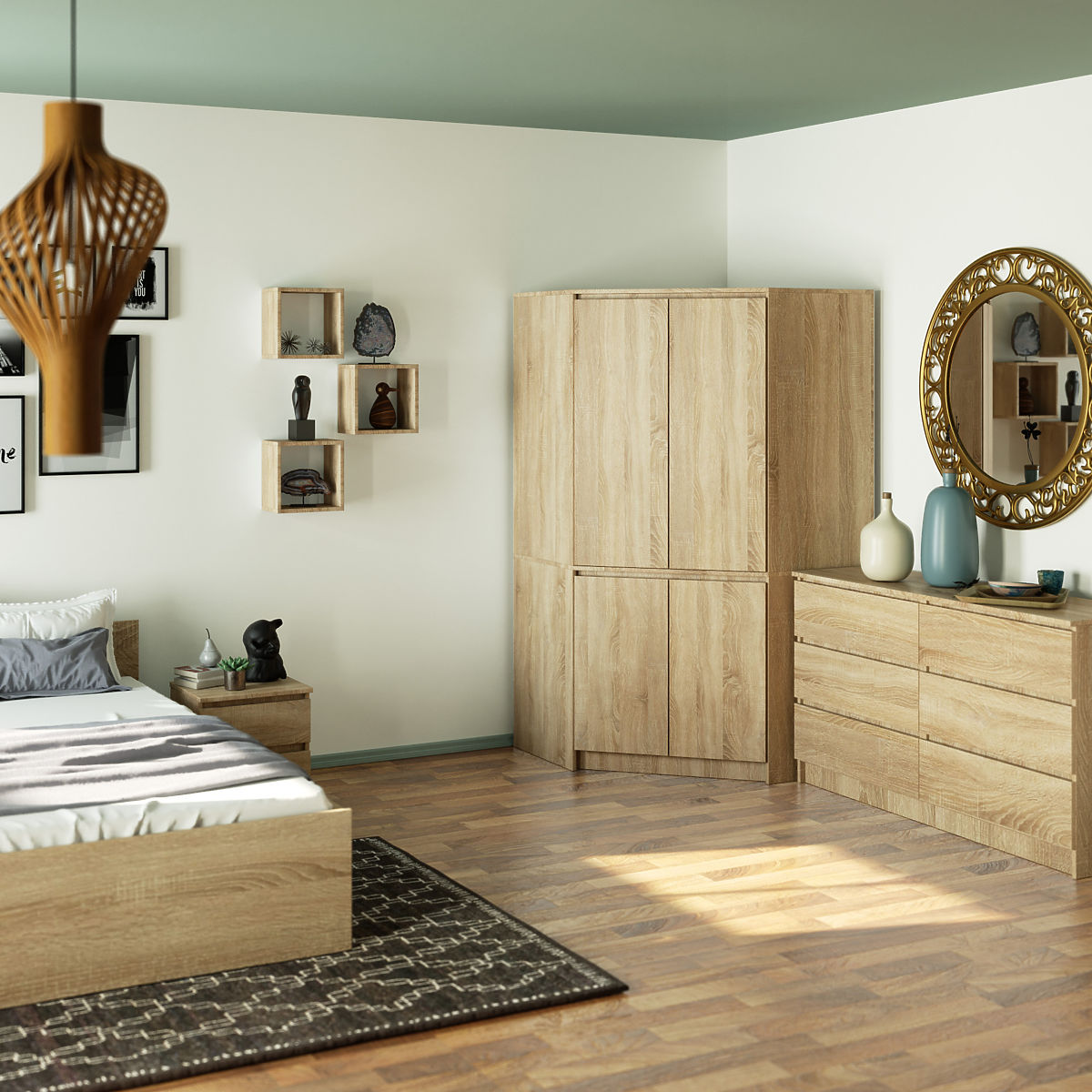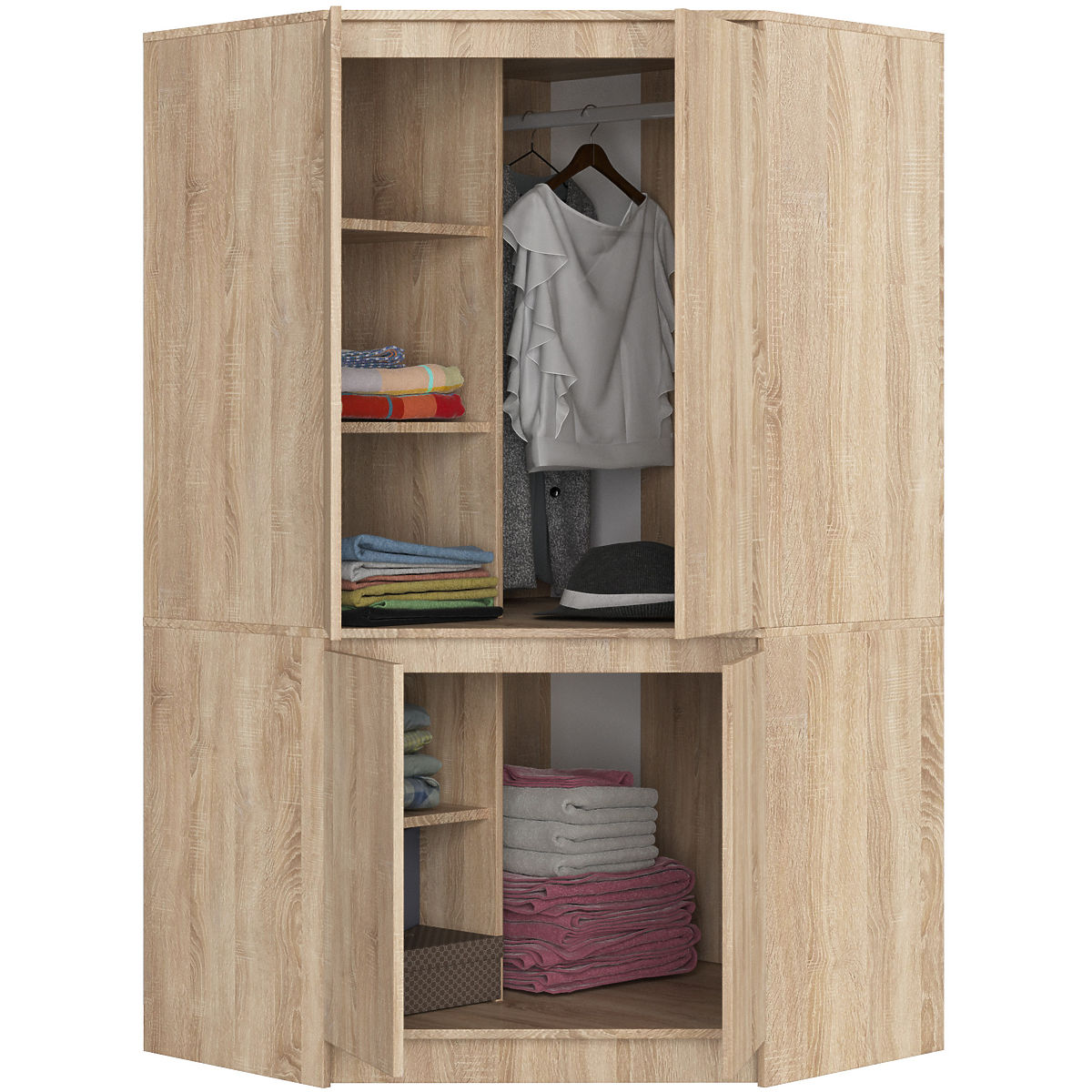 Čtyřdveřová šatní skříň je vyrobena z odolné laminované desky. Korpus nábytku je celý v barvě dub sonoma. Vybavena tyčí a 6 policemi, což poskytuje mnoho úložného prostoru.