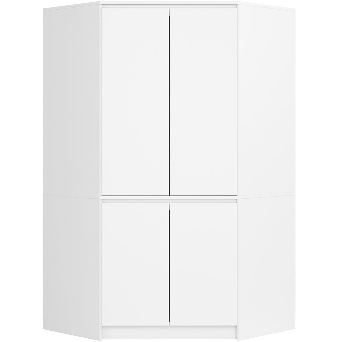 Čtyřdveřová bílá rohová skříň s tyčí a 6 policemi. .. více