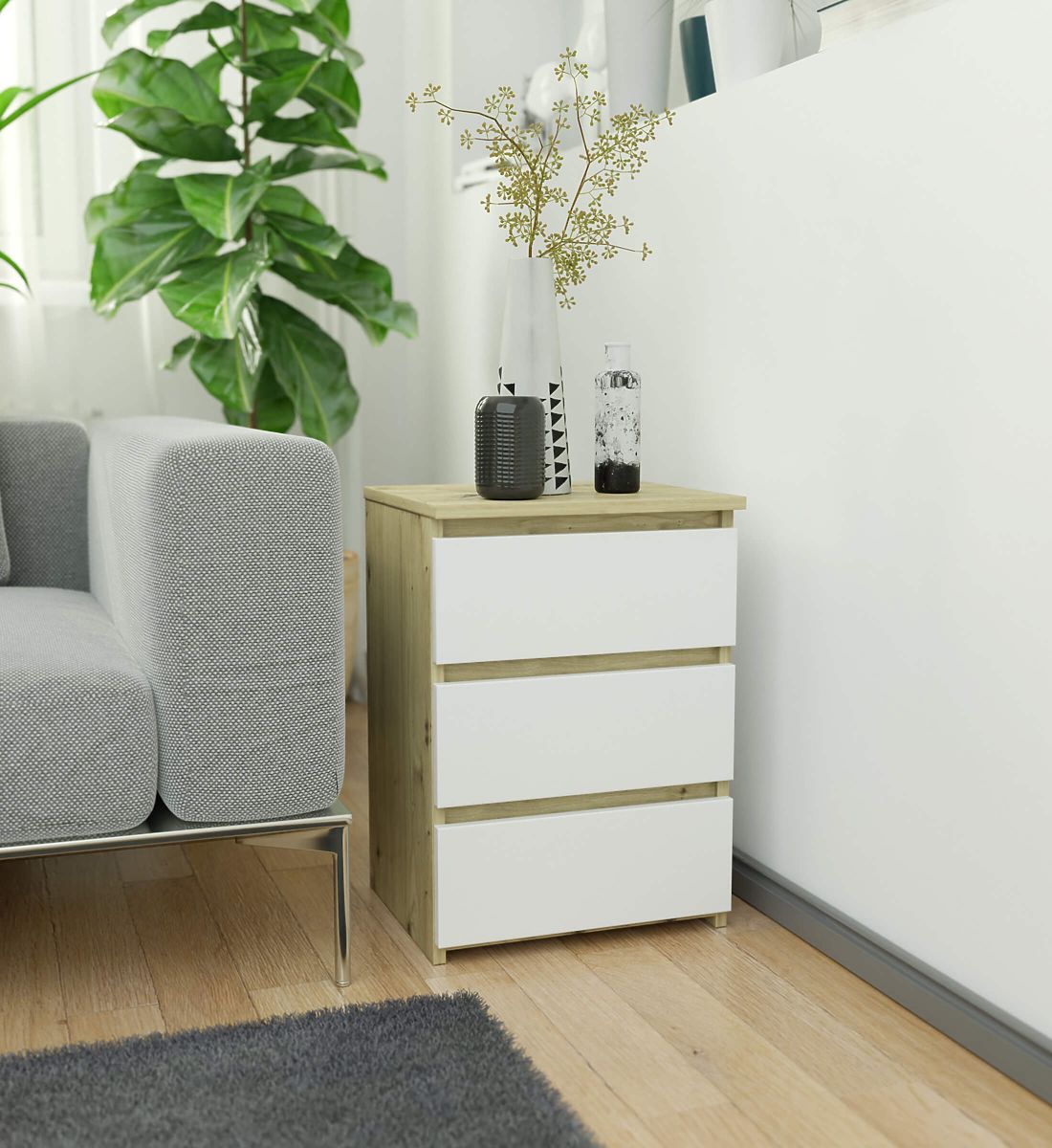 Noční stolky jsou oblíbeným typem nábytku, který se umisťuje u postele. Na jeho desce se nejčastěji nachází lampička, zatímco uvnitř předměty usnadňující odpočinek a spánek. Osoby, které hledají elegantní komodu, by měly věnovat pozornost nočnímu stolku CL3 40 cm v barvě dub artisan s bílými čely. Bude se krásně vyjímat v každé ložnici. Lze jej také umístit do dětského pokoje.