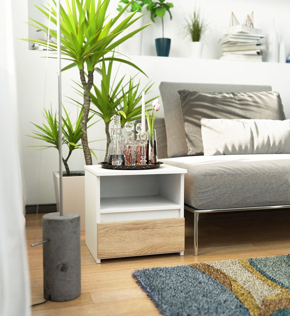 Noční stolky jsou oblíbeným typem nábytku, který se umisťuje vedle postele. Na jeho desce se nejčastěji nachází lampička, zatímco uvnitř předměty usnadňující odpočinek a spánek. Osoby, které hledají elegantní komodu, by měly věnovat pozornost nočnímu stolku CL1 40 cm v barvě bílá / dub sonoma. Bude se krásně vyjímat v každé ložnici. Lze jej také umístit do dětského pokoje.