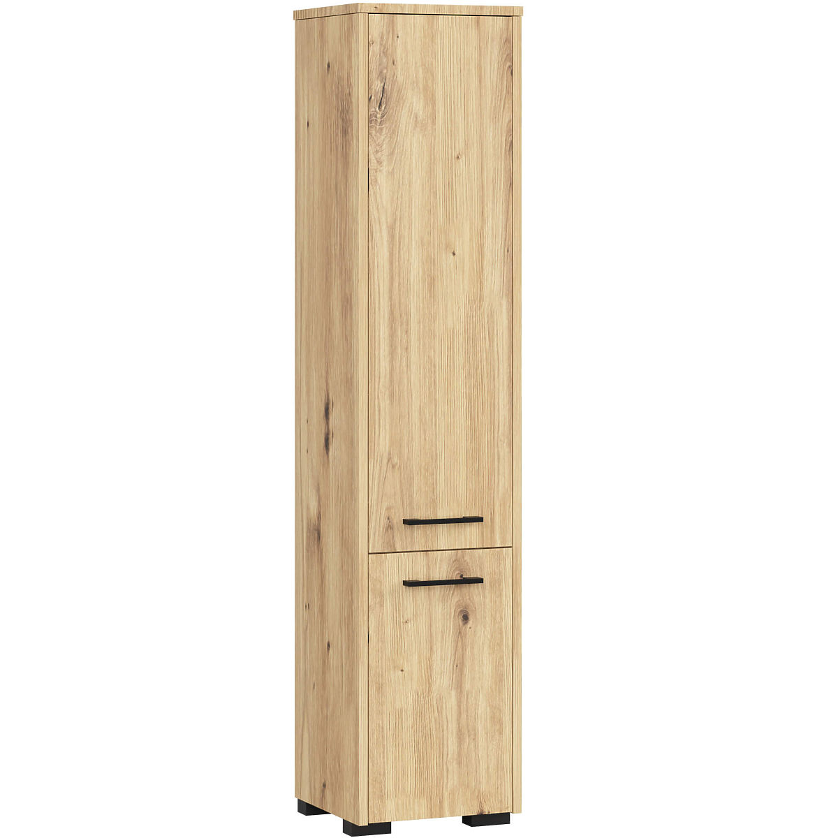 Koupelnová skříňka Fin 2 dveře je univerzální kus nábytku, který lze využít v každé koupelně, bez ohledu na její velikost. Elegantní design a barevnost dub artisan zajišťuje, že skříňka dokonale ladí s koupelnou v jakémkoli stylu, s klasickým nebo moderním vybavením, a také s dlažbou a obklady v různých odstínech. Díky svým rozměrům může koupelnová skříňka vyplnit často nevyužitý prostor v rohu koupelny, stejně jako být umístěna vedle umyvadla, pračky nebo sprchového koutu. Stojící koupelnová skříňka Fin se vyznačuje velmi pečlivým zpracováním. Má dvoje pohodlná a široká dvířka s ergonomickými úchyty, které zajišťují pohodlný přístup do vnitřku nábytku. Hluboké a prostorné police jsou ideální pro ukládání ručníků, toaletních potřeb, kosmetiky nebo čisticích prostředků. Koupelnová skříňka je vyrobena z laminované desky odolné proti oděru a působení vody. ABS hrany, kterými je skříňka zakončena, jsou odolné, neodbarvují se a dodatečně chrání skříňku před poškozením.