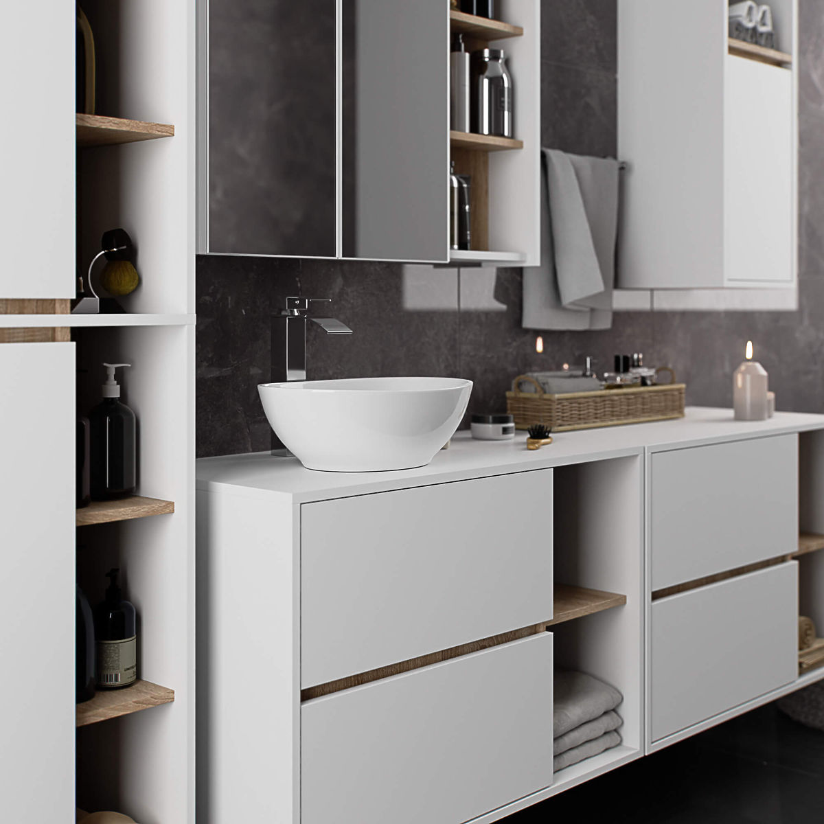Szafki łazienkowe świetnie uzupełniają wyposażenie łazienki, zapewniając niezbędne miejsce na wszelkie kosmetyki i detergenty oraz nadając łazience określony styl. Pojemne szafki ułatwiają zachowanie porządku w pomieszczeniu, co korzystnie wpływa na estetykę wnętrza. Kolekcja VAMI wyróżnia się przykuwającą uwagę stylową kolorystyką – korpus oraz fronty mają taką samą barwę, natomiast kolor wewnętrzny jest inny.