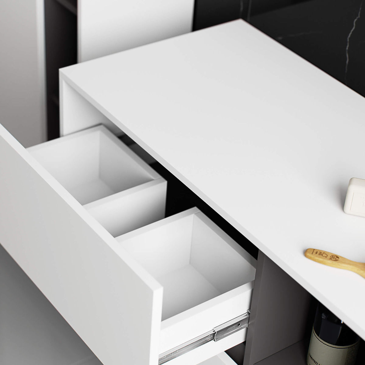 Nasze meble są wyprodukowane z płyty wiórowej laminowanej o grubości 16 mm. Dzięki temu są bardzo trwałe, wytrzymałe i odporne na wilgoć. Nie należy ich jednak narażać na długotrwały kontakt z wodą, która może prowadzić do puchnięcia i odkształcenia płyty. Szafki z szufladami zostały wyposażone w prowadnice kulkowe, które dbają o to, aby szuflady wysuwały się lekko i cicho.