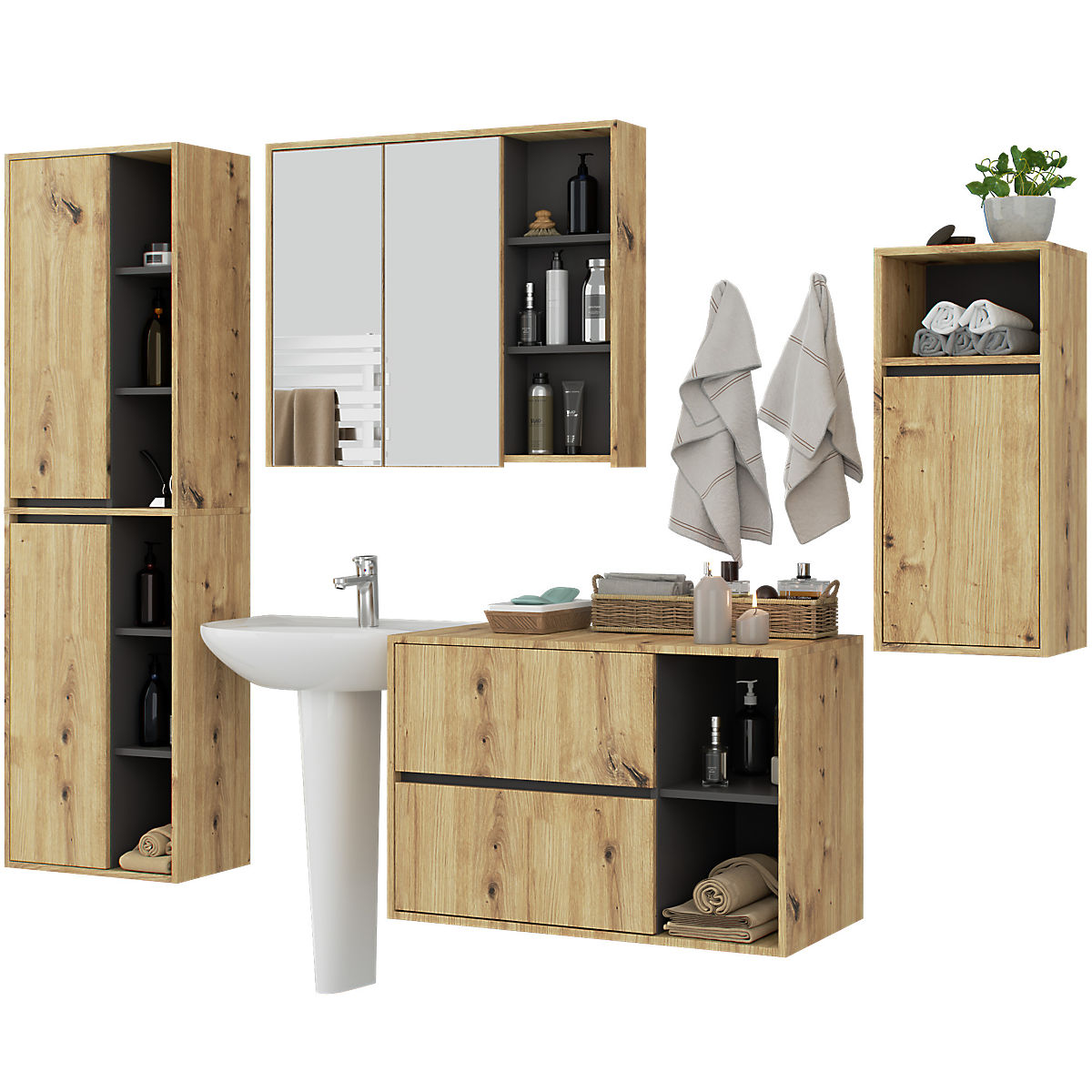 Lukafurniture.cz » Koupelna a WC / Koupelnové sestavy / SADA ZÁVĚSNÉHO KOUPELNOVÉHO NÁBYTKU VAMI DUB ARTISAN / GRAFIT ŠEDÝ
