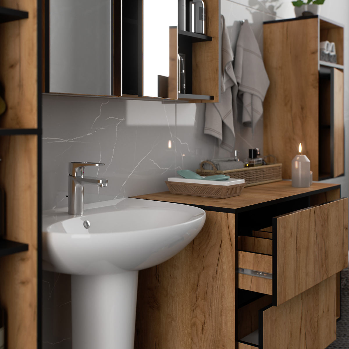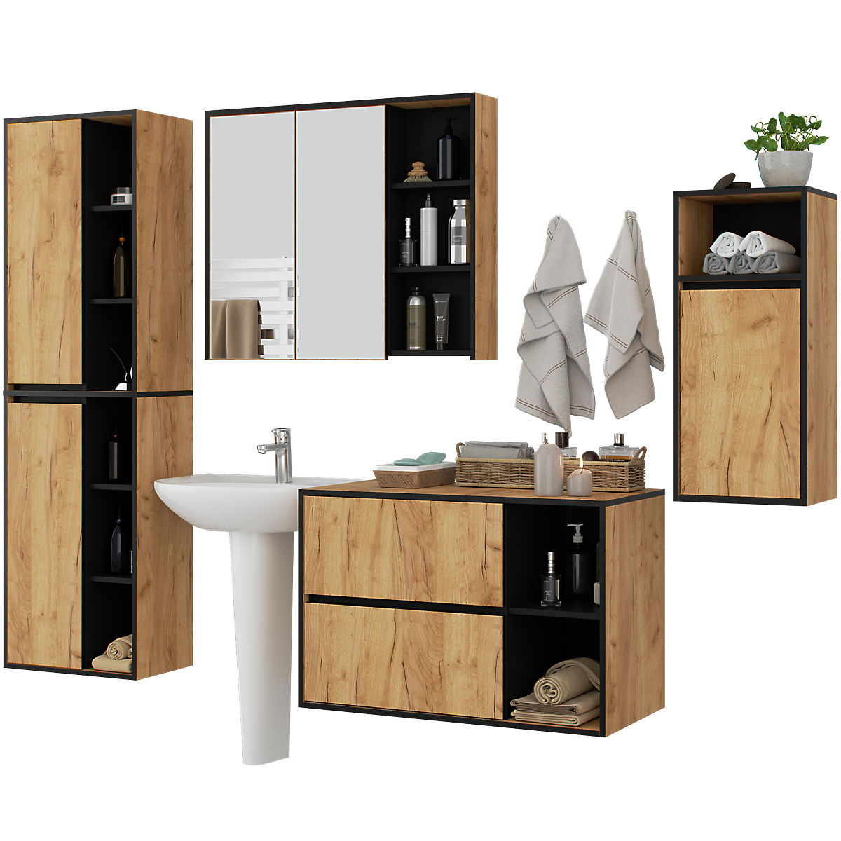 Lukafurniture.cz » Koupelna a WC / Koupelnové sestavy / SADA ZÁVĚSNÉHO KOUPELNOVÉHO NÁBYTKU VAMI DUB CRAFT / ČERNÁ