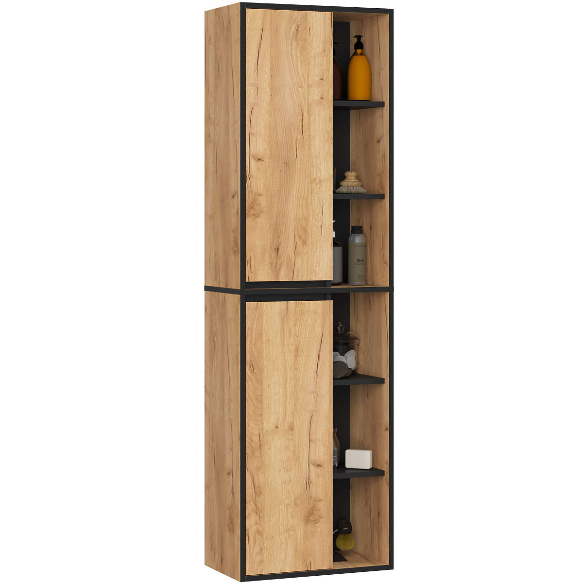 Sada koupelnového nábytku VAMI je kvintesencí moderního stylu. Díky otevřeným policím jsou skříňky vizuálně lehké a dokonale zapadají do nejnovějších designových trendů. Koupelnový nábytek VAMI nabízí také značný uzavřený prostor pro uložení čisticích prostředků, koupelnových potřeb a kosmetiky. Sada obsahuje závěsnou skříňku pod umyvadlo s deskou, 2 zásuvkami a 2 otevřenými policemi (W90), závěsnou skříňku s 1 otevřenou policí W35, vysokou závěsnou skříňku W50 se 6 otevřenými policemi a závěsnou skříňku se zrcadlem a 3 otevřenými policemi W90. Celkově je barevně a stylově konzistentní, což dává sadě harmonický vzhled. Skříňka pod umyvadlo má tvarované zásuvky umožňující montáž sifonu a hydraulických prvků. Sada obsahuje: