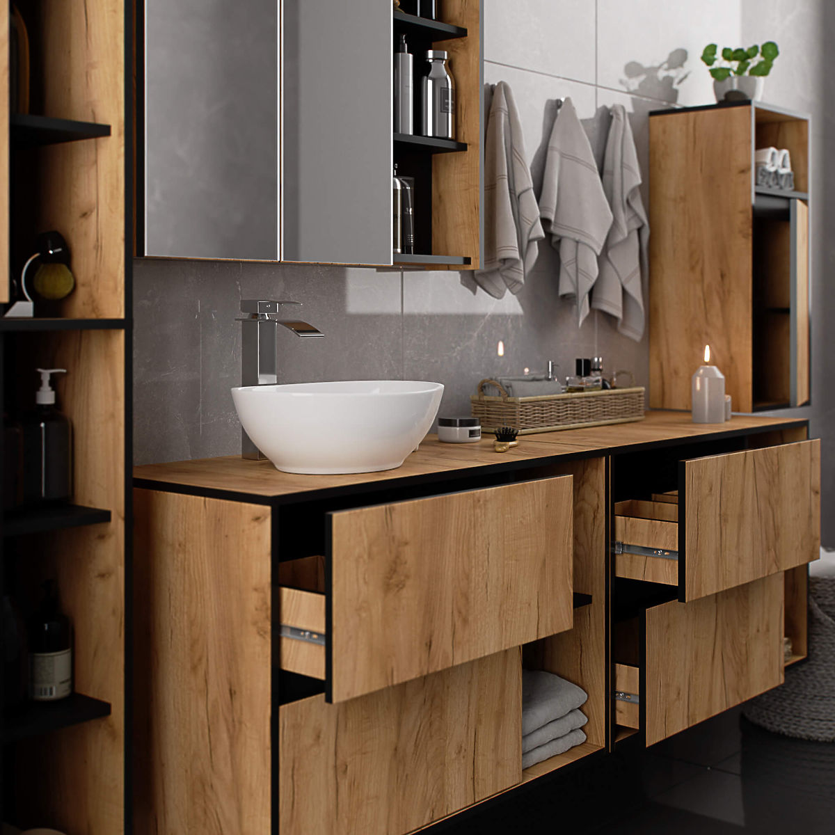 Závěsná skříňka do koupelny pod umyvadlo 90 cm VAMI W90 perfektně zapadá do moderního interiéru. Konfigurace se 2 zásuvkami a 2 otevřenými policemi nabízí velké pohodlí při používání. Do prostorných zásuvek lze uložit hygienické a kosmetické produkty, zatímco na otevřené police lze umístit například dekorace, které dodají interiéru osobitější charakter. Tento model závěsné skříňky pod umyvadlo má v desce 2 otvory určené pro montáž umyvadla a sifonu. Skříňka má také speciálně tvarované zásuvky, které umožňují instalaci sifonu a hydraulických prvků. POZOR! Nábytek je dodáván bez umyvadla a armatury.