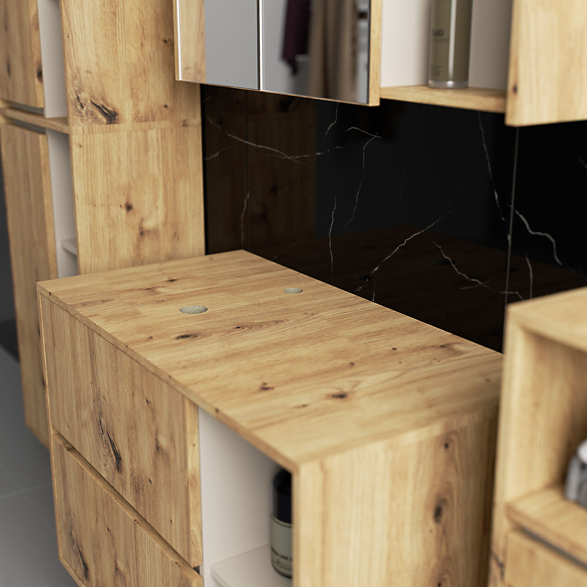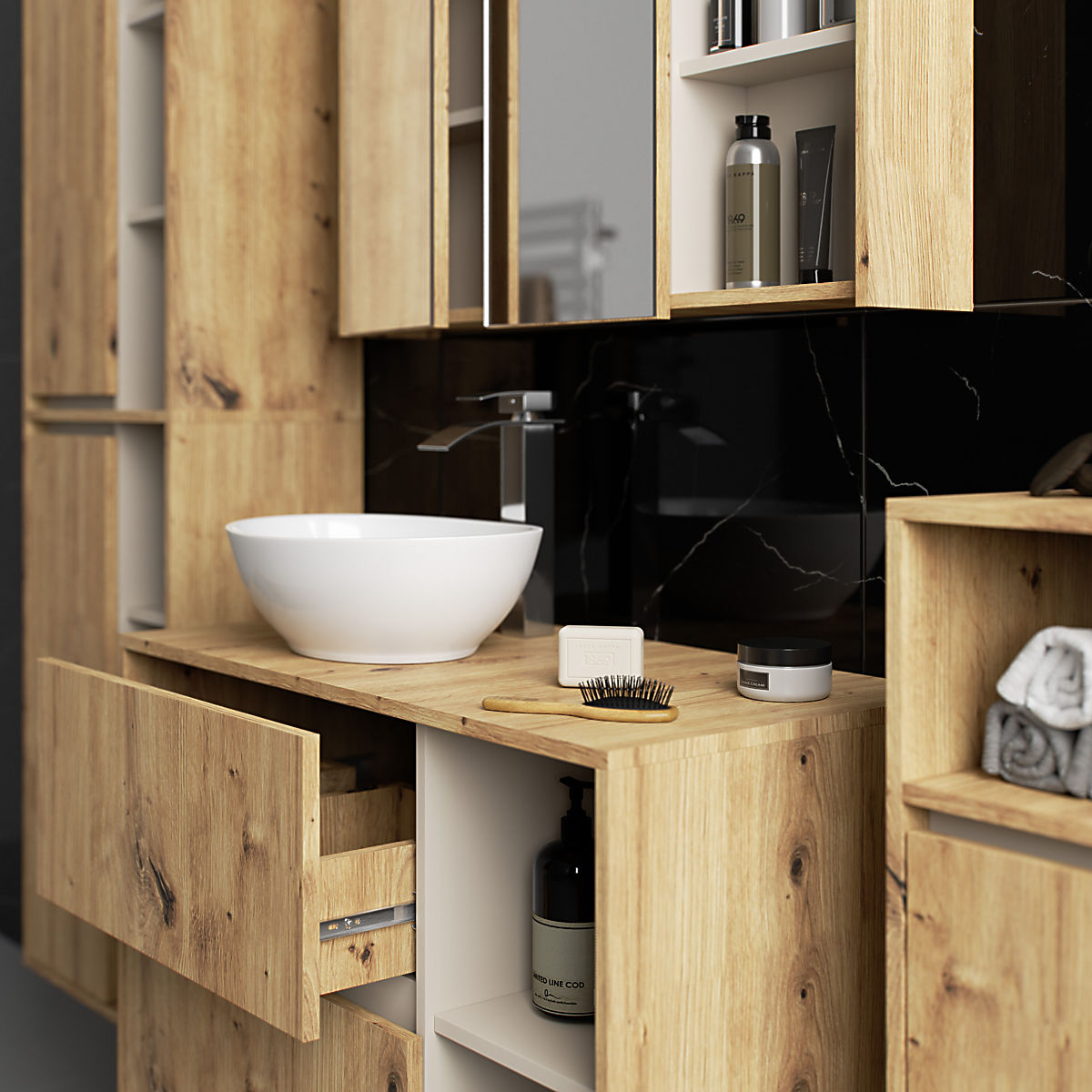 Lukafurniture.cz » Koupelna a WC / Koupelnové sestavy / SADA ZÁVĚSNÉHO KOUPELNOVÉHO NÁBYTKU S OTVORY VAMI DUB ARTISAN / KAŠMÍR