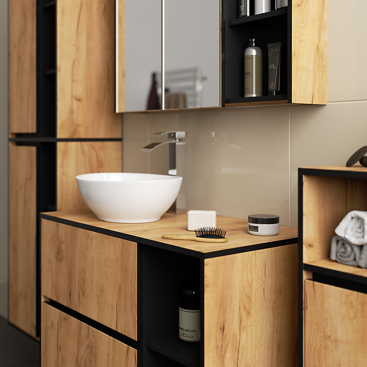 Lukafurniture.cz » Koupelna a WC / Koupelnové sestavy / SADA ZÁVĚSNÉHO KOUPELNOVÉHO NÁBYTKU S OTVORY VAMI DUB CRAFT / ČERNÁ