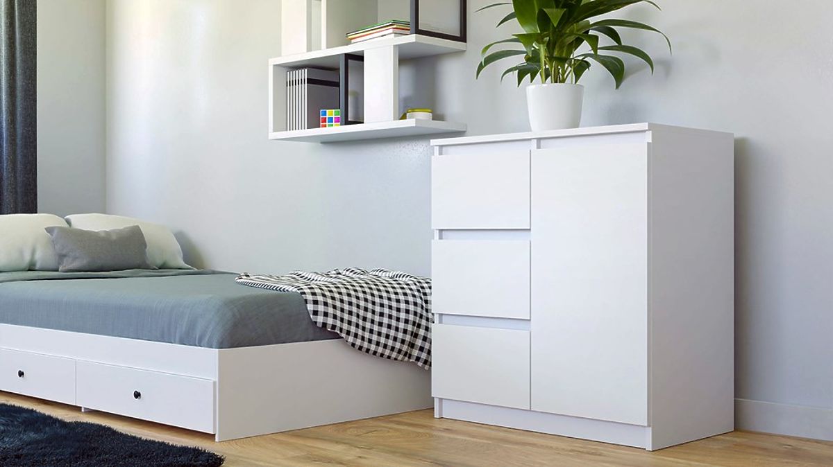 Moderní komoda 1D3S je funkční a prostorný nábytek, který vybaví interiér vaší ložnice, obývacího pokoje nebo dětského pokoje.