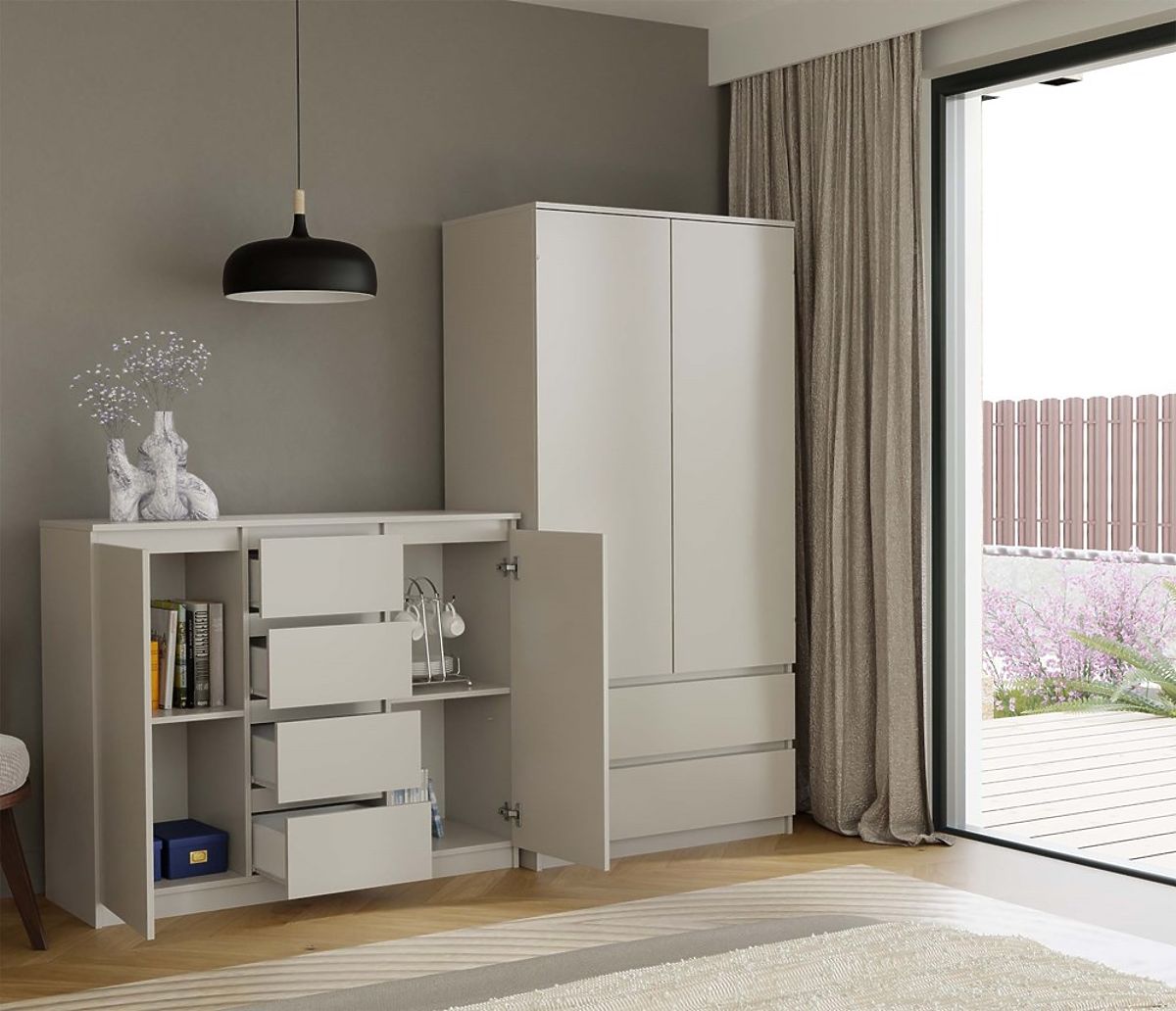 Stylová komoda s 2 dvířky a 4 zásuvkami v barvě kašmír. .. více