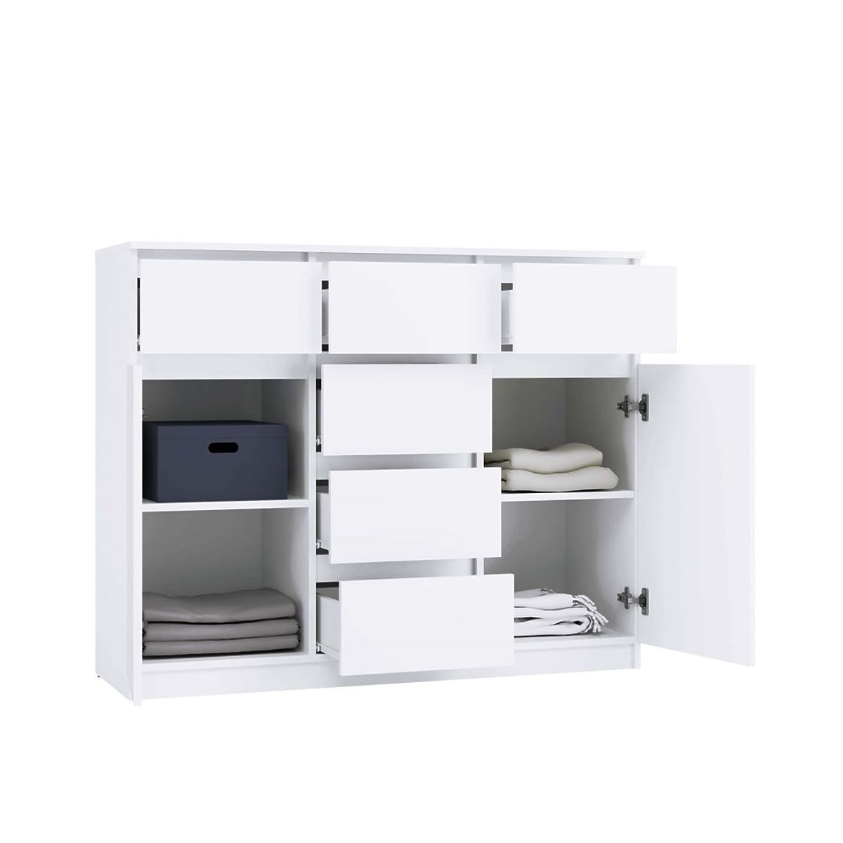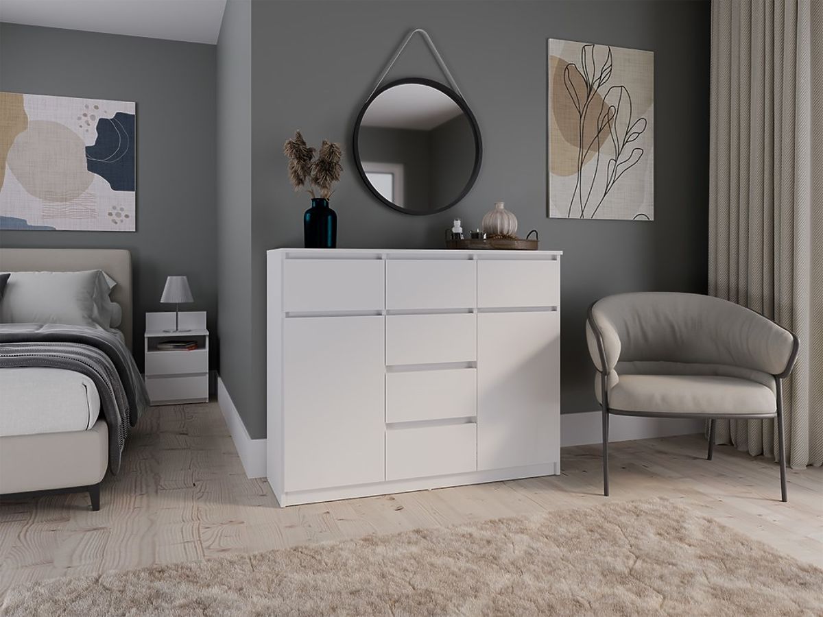 • Prostornost a funkčnost: Komoda je vybavena 2 dveřmi a 6 prostornými zásuvkami, které pomohou s organizací vašeho prostoru. Ideální do ložnice, obývacího pokoje, dětského pokoje nebo předsíně – všude tam, kde potřebujete další úložný prostor.