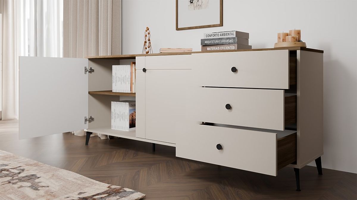 Uspořádání 2 dveří a 3 zásuvek poskytuje dostatek úložného prostoru – jak pro každodenní potřeby, tak pro věci, které chceme mít mimo dohled.