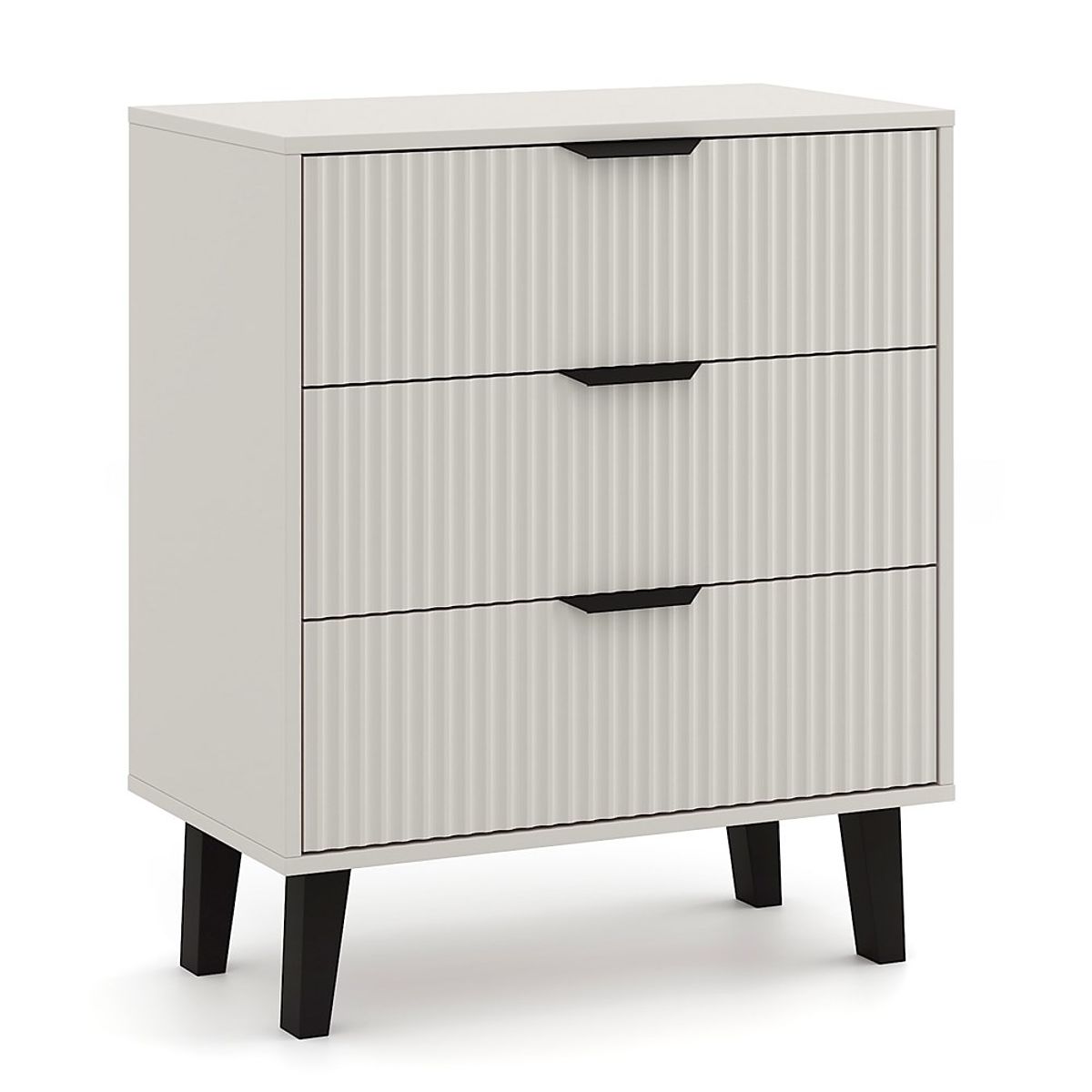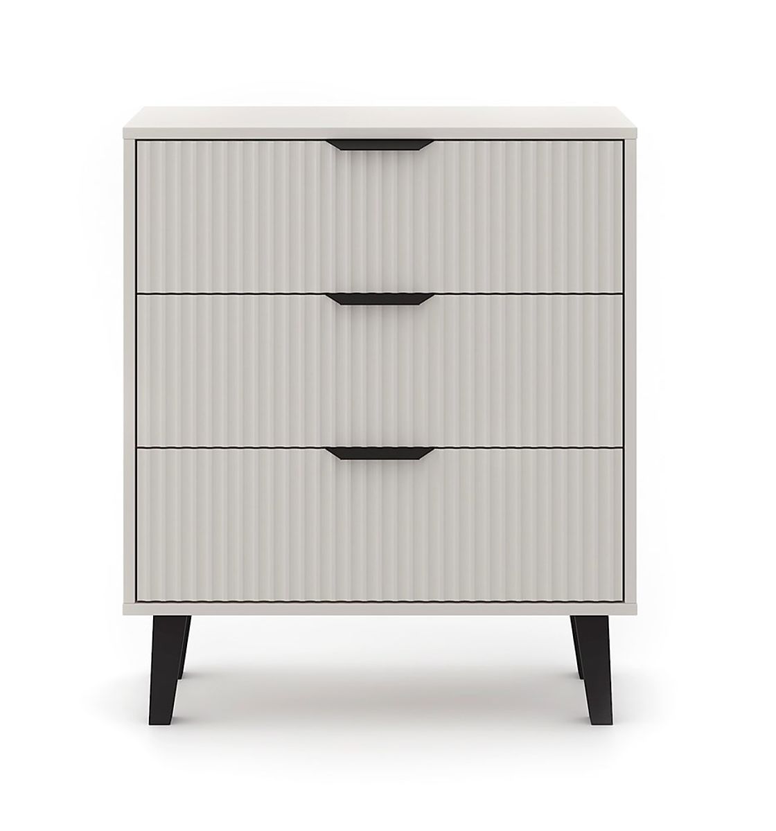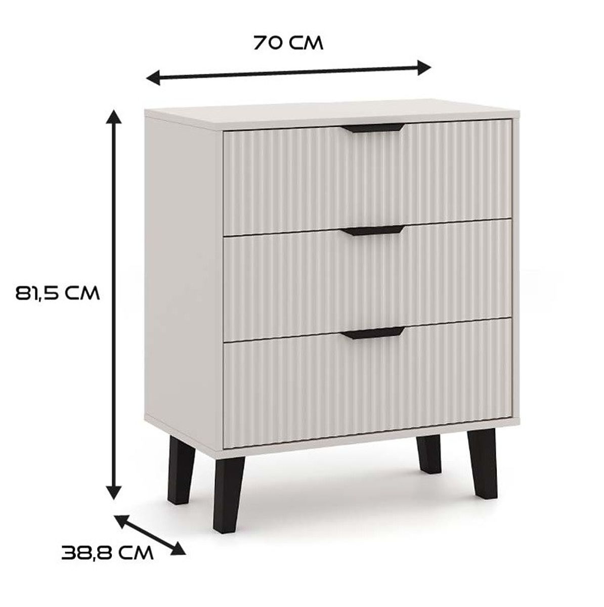 Komoda SCANDI 3S SLIM je ideální volbou pro ty, kteří hledají praktický úložný nábytek s nádechem moderního designu. Módní barva Kašmír v kombinaci s drážkovanými čely a vysokými černými nohami dodává interiéru útulnost a zároveň eleganci.