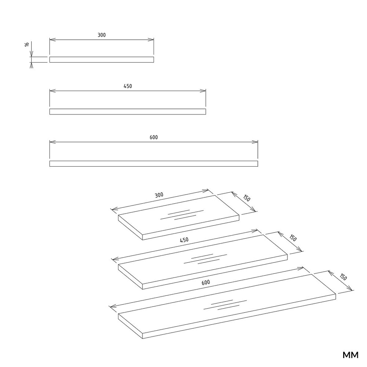 Police jsou vyrobeny z laminované nábytkové desky o tloušťce 16 mm