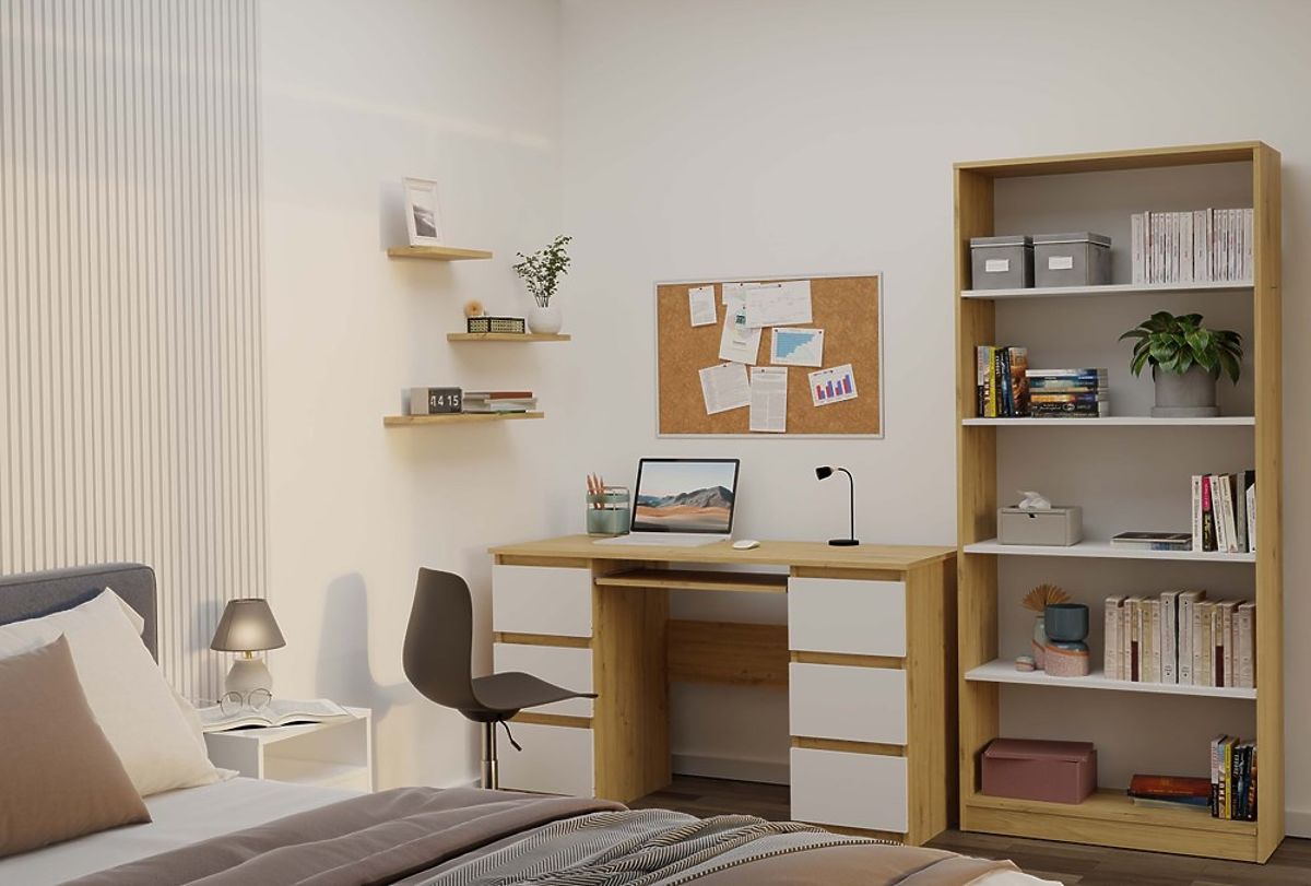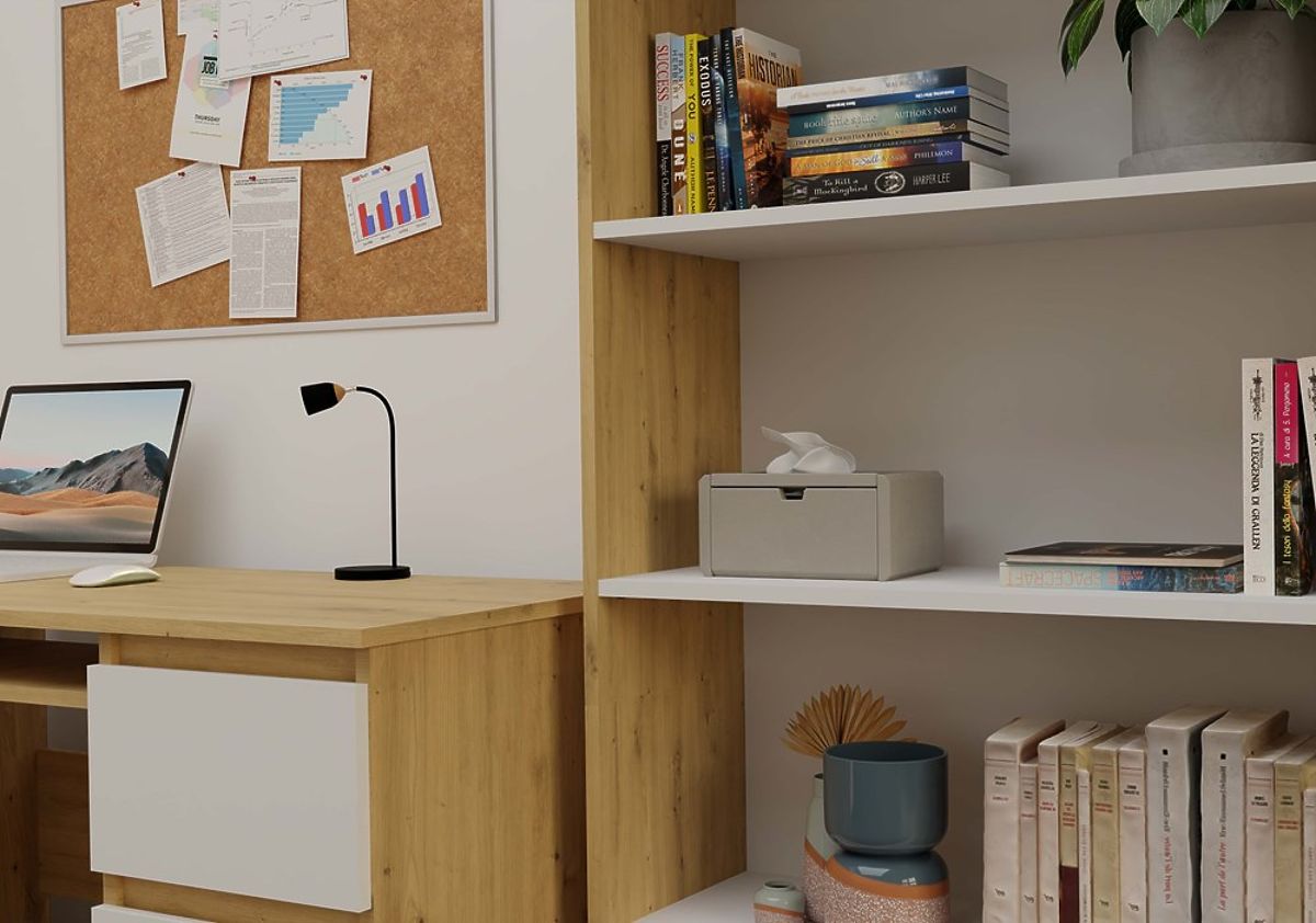 Regál R80 je stylové a praktické řešení pro ukládání knih, šanonů, dekorací a kancelářských materiálů. Spojení teplého odstínu dubu artisan s kontrastními bílými policemi dodává nábytku moderní a elegantní charakter. Skvěle se hodí jak do kanceláře, obývacího pokoje, dětského pokoje, tak i do domácí knihovny.