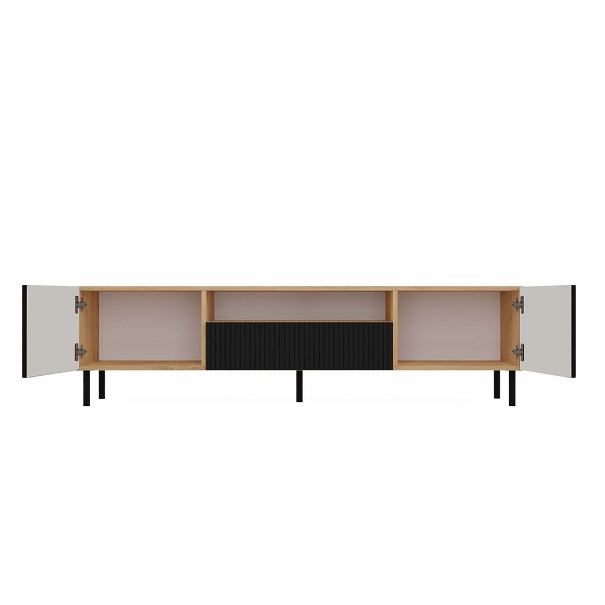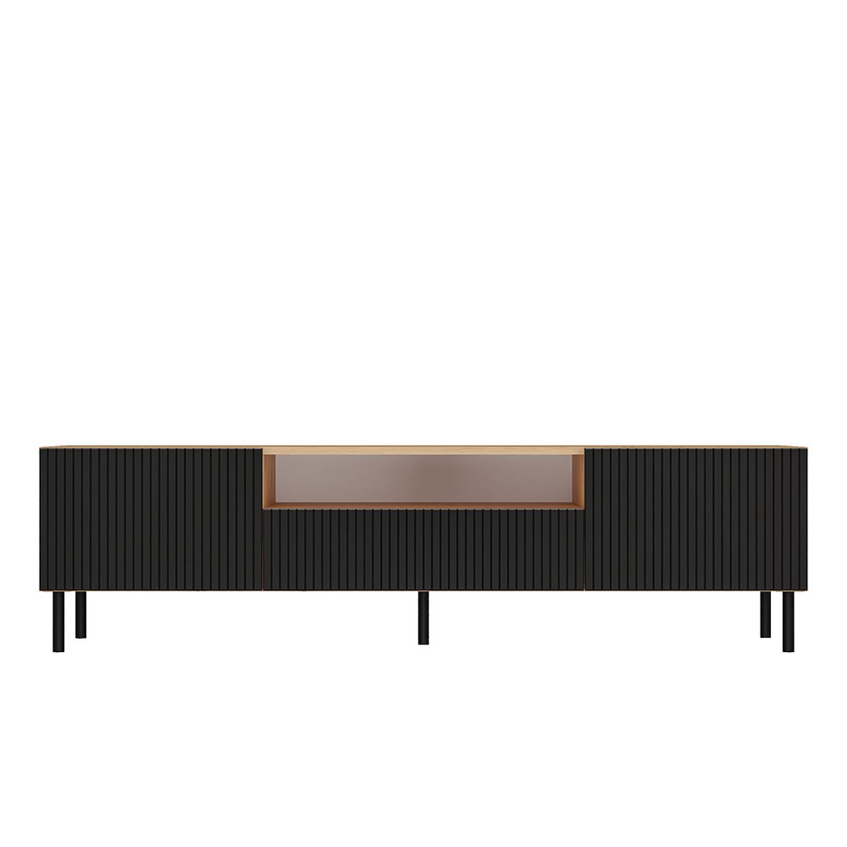 Velkou výhodou jsou kulaté kovové nohy o výšce 13 cm, které dodávají celé konstrukci vizuální lehkost a zajišťují stabilitu TV skříňky.