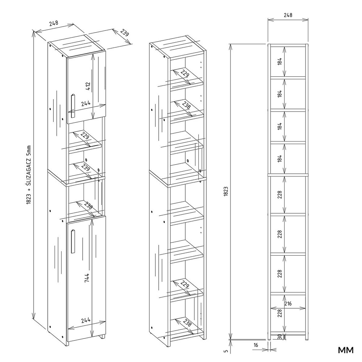 Uzavíratelná skříňka se 2 dveřmi – zakrývá 3 spodní police a 2 horní police, zatímco 3 zůstávají volným prostorem pro drobnosti